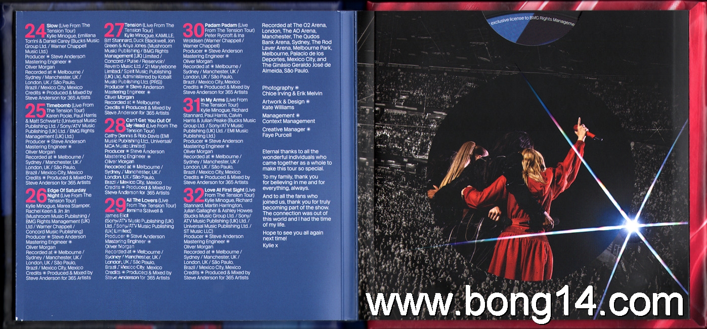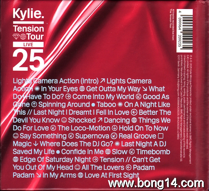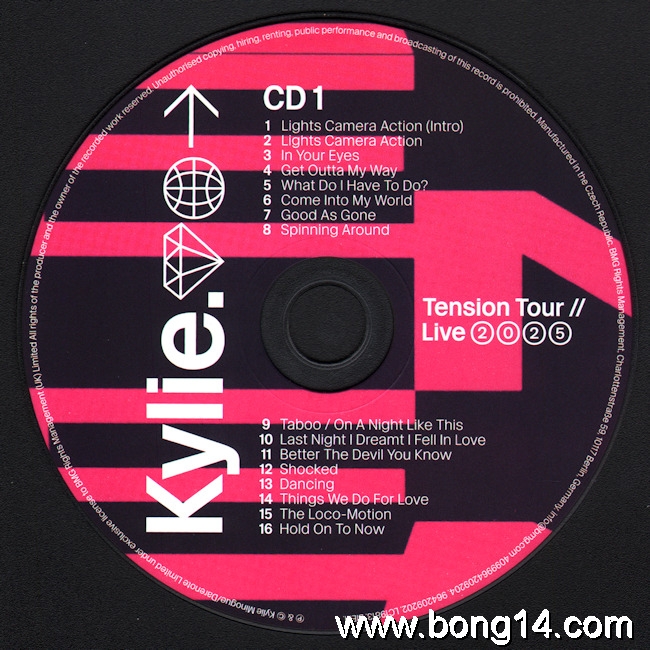 CD/1254: Kylie - Tension Tour // Live 2025 - EU - 2026 - BMG - 964209230 - 4099964209235     Matrixcode CD1: 330611 964209230-CD1Matrixcode CD2: 330612 964209230-CD2Mould SID Code(CD1): DFM02Mastering SID Code(CD1): LBR DF01Mould SID Code(CD2): DFM10Mastering SID Code(CD2): LBR DF011: Lights Camera Action (Intro) - 00:002: Lights Camera Action - 00:003: In Your Eyes - 00:004: Get Outta My Way - 00:005: What Do I Have To Do? - 00:006: Come Into My World - 00:007: Good As Gone - 00:008: Spinning Around - 00:009: Taboo / On A Night Like This - 00:0010: Last Night I Dreamt I Fell In Love - 00:0011: Better The Devil You Know - 00:0012: Shocked - 00:0013: Dancing - 00:0014: Things We Do For Love - 00:0015: The Loco-Motion - 00:0016: Hold On To Now - 00:0017: Say Something - 00:0018: Supernova - 00:0019: Real Groove - 00:0020: Magic - 00:0021: Where Does The DJ Go? - 00:0022: Last Night A DJ Saved My Life - 00:0023: Confide In Me - 00:0024: Slow - 00:0025: Timebomb - 00:0026: Edge Of Saturday Night - 00:0027: Tension - 00:0028: Can't Get You Out Of My Head - 00:0029: All The Lovers - 00:0030: Padam Padam - 00:0031: In My Arms - 00:0032: Love At First Sight - 00:00 |