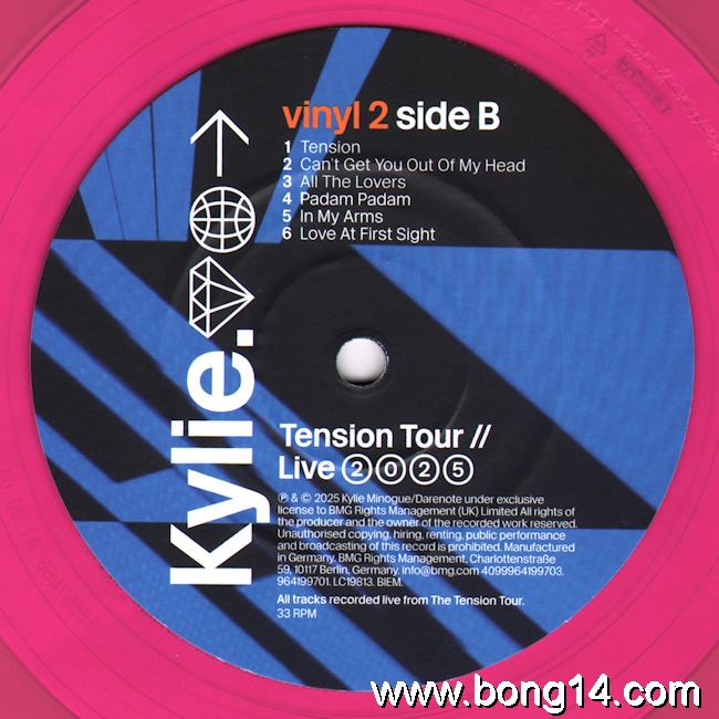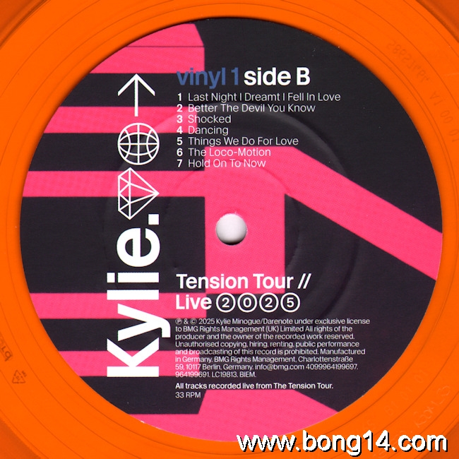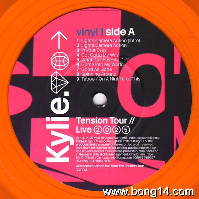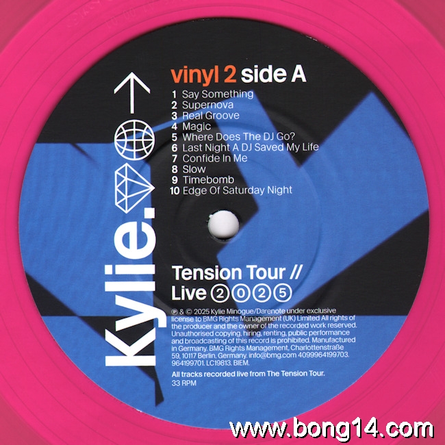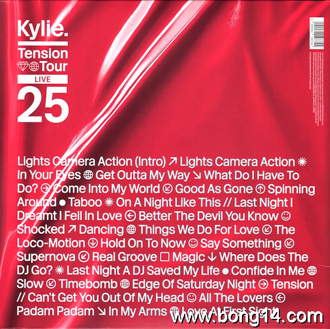LP/706: Kylie - Tension Tour // Live 2025 - EU - 2026 - BMG - 964198741 - 4099964198744         Matrixcode Seite 1: 58657464 A1 00 01 MILES. ABBEY ROAD. 1/2 SPEED. ROOM 30 [EcoRecord logo] ♳ PETMatrixcode Seite 2: XX XX 58657465 B1 01 01 MILES. ABBEY ROAD. 1/2 SPEED. ROOM 30 [EcoRecord logo] ♳ PETMatrixcode Seite 3: 58657466 A1 00 01 MILES. ABBEY ROAD. 1/2 SPEED. ROOM 30 [EcoRecord logo] ♳ PETMatrixcode Seite 4: 58657537 B1 00 01 MILES. ABBEY ROAD. 1/2 SPEED. ROOM 30 [EcoRecord logo] ♳ PET1: Lights Camera Action (Intro) - 00:002: Lights Camera Action - 00:003: In Your Eyes - 00:004: Get Outta My Way - 00:005: What Do I Have To Do? - 00:006: Come Into My World - 00:007: Good As Gone - 00:008: Spinning Around - 00:009: Taboo / On A Night Like This - 00:0010: Last Night I Dreamt I Fell In Love - 00:0011: Better The Devil You Know - 00:0012: Shocked - 00:0013: Dancing - 00:0014: Things We Do For Love - 00:0015: The Loco-Motion - 00:0016: Hold On To Now - 00:0017: Say Something - 00:0018: Supernova - 00:0019: Real Groove - 00:0020: Magic - 00:0021: Where Does The DJ Go? - 00:0022: Last Night A DJ Saved My Life - 00:0023: Confide In Me - 00:0024: Slow - 00:0025: Timebomb - 00:0026: Edge Of Saturday Night - 00:0027: Tension - 00:0028: Can't Get You Out Of My Head - 00:0029: All The Lovers - 00:0030: Padam Padam - 00:0031: In My Arms - 00:0032: Love At First Sight - 00:00 |
