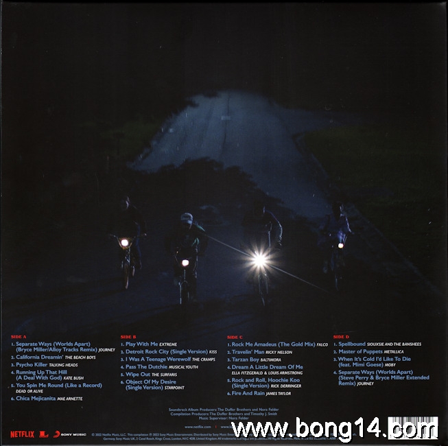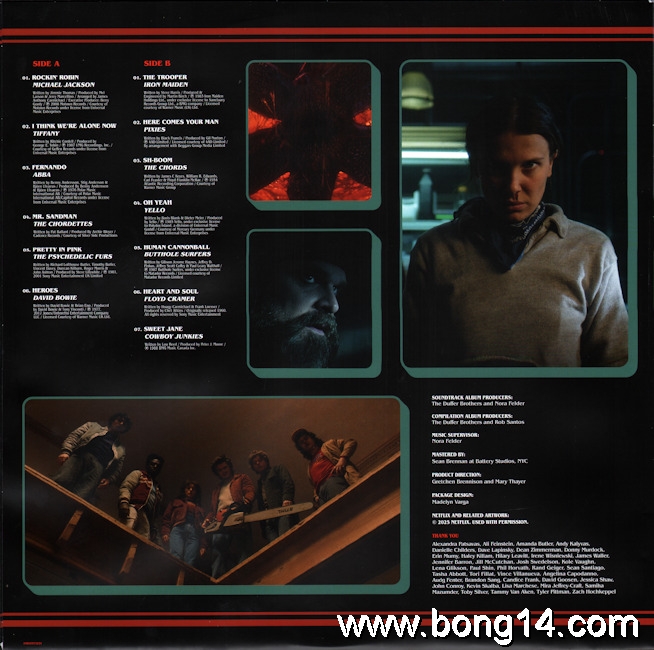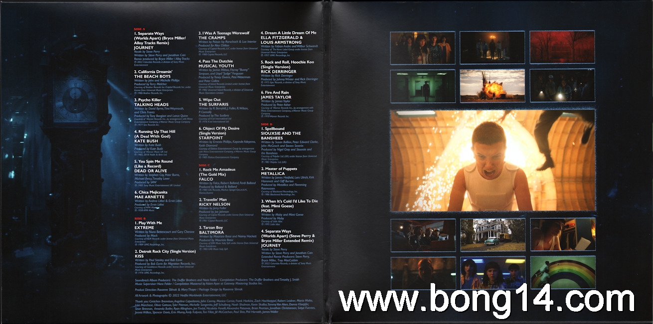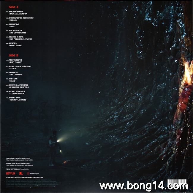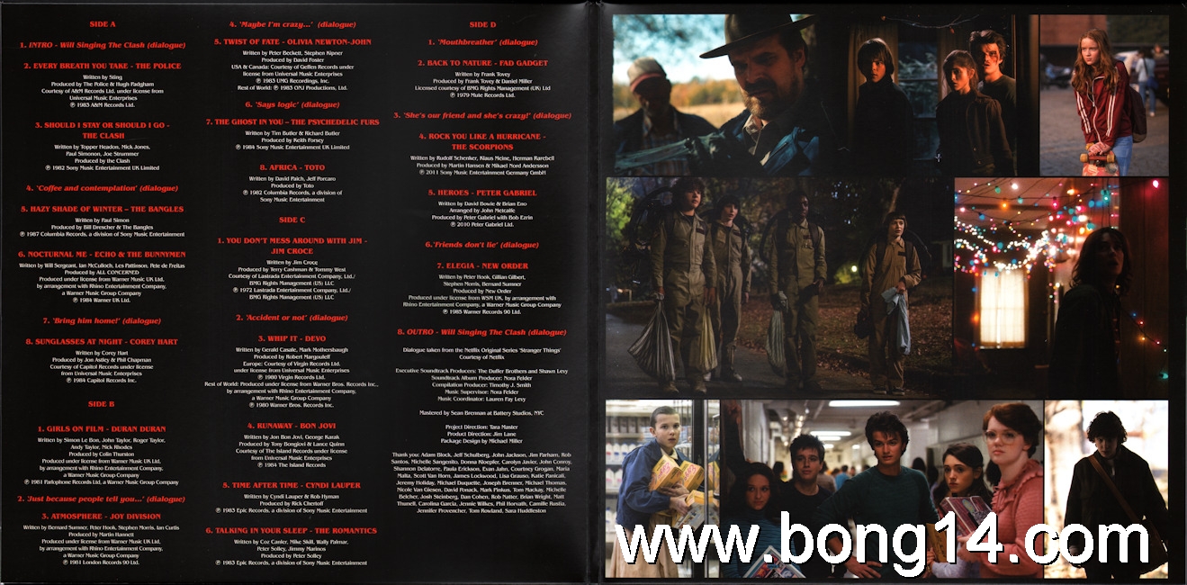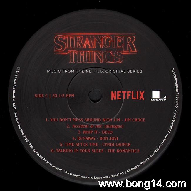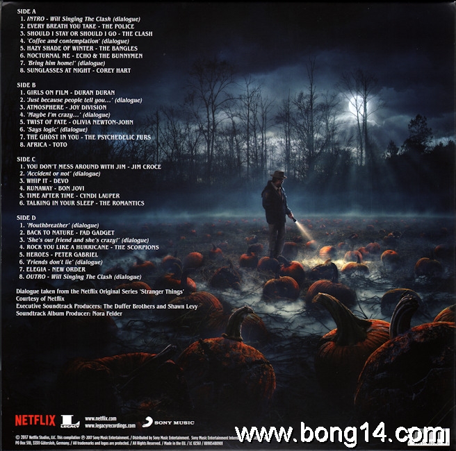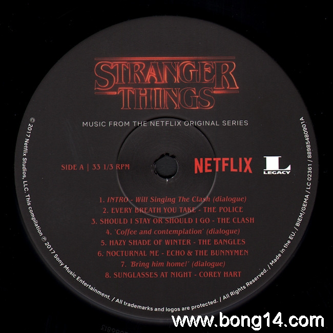 LP/704: Various - Stranger Things (Music From The Netflix Original Series) - EU - 2018 - Legacy - 88985480901 - 889854809010        Matrixcode Seite 1: 166251E1/K 02386813Matrixcode Seite 2: 166251E2/O 02401734Matrixcode Seite 3: 166251E3/O 02403737Matrixcode Seite 4: 166251E4/T 023868961: Intro - Will Singing The Clash (Dialogue) / Noah Schnapp - 00:002: Every Breath You Take / The Police - 00:003: Should I Stay Or Should I Go / The Clash - 00:004: 'Coffee And Contemplation' (Dialogue) / Susan Shalhoub Larkin, David Harbour - 00:005: Hazy Shade Of Winter / The Bangles - 00:006: Nocturnal Me / Echo And The Bunnymen - 00:007: 'Bring Him Home!' (Dialogue) / Wynona Ryder - 00:008: Sunglasses At Night / Corey Hart - 00:009: Girls On Film / Duran Duran - 00:0010: 'Just Because People Tell You...' (Dialogue) / Charlie Heaton - 00:0011: Atmosphere / Joy Division - 00:0012: 'Maybe I'm Crazy...' (Dialogue) / Wanona Ryder - 00:0013: Twist Of Fate / Olivia Newton-John - 00:0014: 'Says Logic' (Dialogue) / Finn Wolfhard, Gaten Matarazzo - 00:0015: The Ghost In You / The Psychedelic Furs - 00:0016: Africa / Toto - 00:0017: You Don't Mess Around With Jim / Jim Croce - 00:0018: 'Accident Or Not' (Dialogue) / Gaten Matarazzo, Caleb McLaughlin, Finn Wolfhard - 00:0019: Whip It / Devo - 00:0020: Runaway / Bon Jovi - 00:0021: Time After Time / Cyndi Lauper - 00:0022: Talking In Your Sleep / The Romantics - 00:0023: 'Mouthbreather' (Dialogue) / Finn Wolfhard, Millie Bobby Brown - 00:0024: Back To Nature / Fad Gadget - 00:0025: 'She's Our Friend And She's Crazy!' (Dialogue) / Gaten Matarazzo - 00:0026: Rock You Like A Hurricane / The Scorpions - 00:0027: Heroes / Peter Gabriel - 00:0028: 'Friends Don't Lie' (Dialogue) / Millie Bobby Brown - 00:0029: Elegia / New Order - 00:0030: Outro - Will Singing The Clash (Dialogue) / Noah Schnapp - 00:00 |