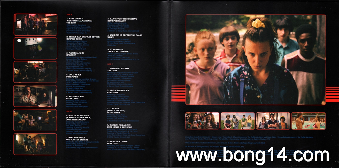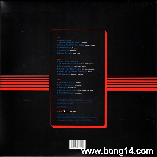 LP/705: Various - Stranger Things 3 (Music From The Netflix Original Series) - EU - 2019 - Legacy - 19075947541 - 1907594754162LP + 7" - side D is empty         Matrixcode Seite 1: 19075947541 A -61187-I SST ALMatrixcode Seite 2: 19075947541 B -61187-I SST ALMatrixcode Seite 3: 19075947541 C -61188-I SST ALMatrixcode Seite 5: 19075947541 A -61186- SST ALMatrixcode Seite 6: 19075947541 B -61186- SST AL1: Baba O'Riley (ConfidentialMX Remix) / The Who - 00:002: Things Can Only Get Better / Howard Jones - 00:003: Material Girl / Madonna - 00:004: Cold As Ice / Foreigner - 00:005: She's Got You / Patsy Cline - 00:006: R.O.C.K. In The U.S.A. (A Salute To 60's Rock) / John Mellencamp - 00:007: Neutron Dance / The Pointer Sisters - 00:008: Can't Fight This Feeling / REO Speedwagon - 00:009: Wake Me Up Before You Go-Go / Wham! - 00:0010: My Bologna / "Weird Al" Yankovic - 00:0011: Moving In Stereo / The Cars - 00:0012: Never Surrender / Corey Hart - 00:0013: Lovergirl / Teena Marie - 00:0014: Workin' For A Livin' / Huey Lewis & The News - 00:0015: We'll Meet Again / Very Lynn - 00:0021: Never Ending Story (Upside) / Gaten Matarazzo and Gabriella Pizzolo - 00:0022: Never Ending Story (Downside) / Gaten Matarazzo and Gabriella Pizzolo - 00:00 |