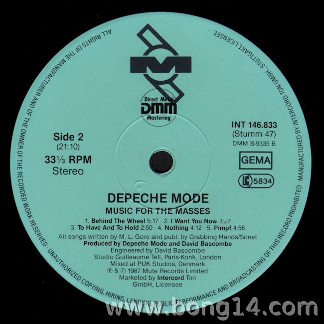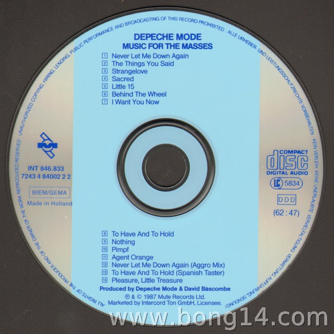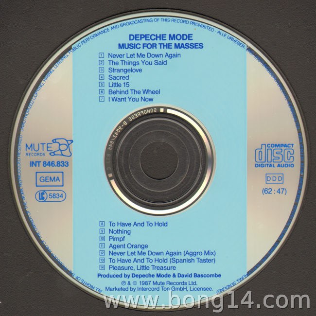 CD/31: Depeche Mode - Music For The Masses - Deutschland - 1987 - Mute Records - INT 846.833 - 4006758468334Matrixcode CD: SONOPRESS B-9542/846 833 C1: Never Let Me Down Again - 00:002: The Things You Said - 00:003: Strangelove - 00:004: Sacred - 00:005: Little 15 - 00:006: Behind The Wheel - 00:007: I Want You Now - 00:008: To Have And To Hold - 00:009: Nothing - 00:0010: Pimpf - 00:0011: Agent Orange - 00:0012: Never Let Me Down Again (Aggro Mix) - 00:0013: To Have And To Hold (Spanish Taster) - 00:0014: Pleasure, Little Treasure (Glitter Mix) - 00:00 |