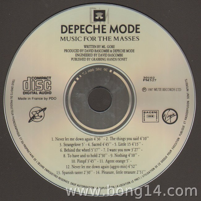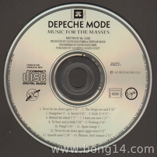 CD/831: Depeche Mode - Music For The Masses - Frankreich - 1987 - Virgin Records - 30176 - 3268440301768Picture CDMatrixcode CD: 30102 550 00 L71: Never Let Me Down Again - 00:002: The Things You Said - 00:003: Strangelove - 00:004: Sacred - 00:005: Little 15 - 00:006: Behind The Wheel - 00:007: I Want You Now - 00:008: To Have And To Hold - 00:009: Nothing - 00:0010: Pimpf - 00:0011: Agent Orange - 00:0012: Never Let Me Down Again (Aggro Mix) - 00:0013: To Have And To Hold (Spanish Taster) - 00:0014: Pleasure, Little Treasure (Glitter Mix) - 00:00 |