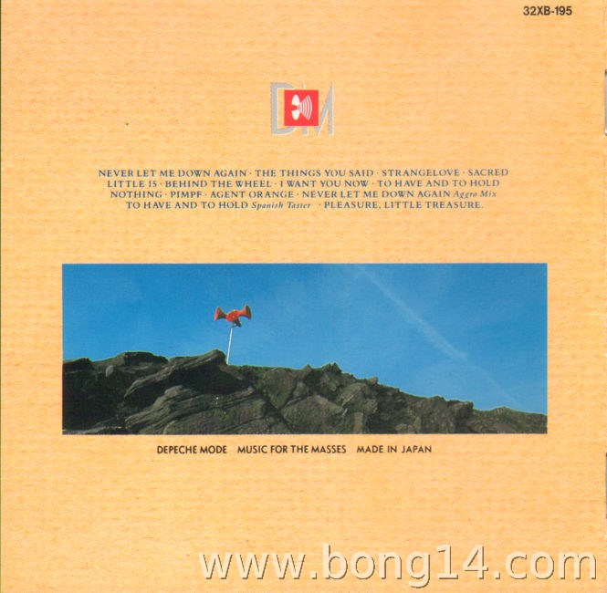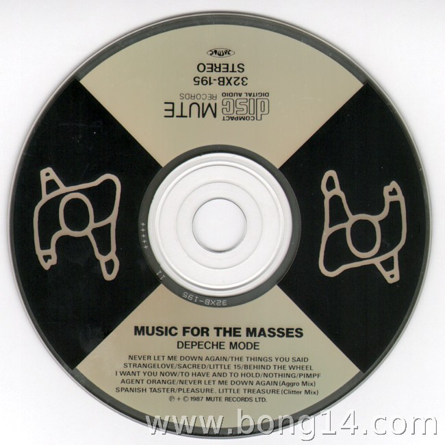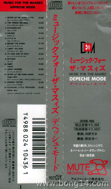 CD/386: Depeche Mode - Music For The Masses - Japan - 1987 - Mute Records - 32XB-195 - 4988024104361Matrixcode CD: 2XB-195 11 +++++1: Never Let Me Down Again - 00:002: The Things You Said - 00:003: Strangelove - 00:004: Sacred - 00:005: Little 15 - 00:006: Behind The Wheel - 00:007: I Want You Now - 00:008: To Have And To Hold - 00:009: Nothing - 00:0010: Pimpf - 00:0011: Agent Orange - 00:0012: Never Let Me Down Again (Aggro Mix) - 00:0013: To Have And To Hold (Spanish Taster) - 00:0014: Pleasure, Little Treasure (Glitter Mix) - 00:00 |