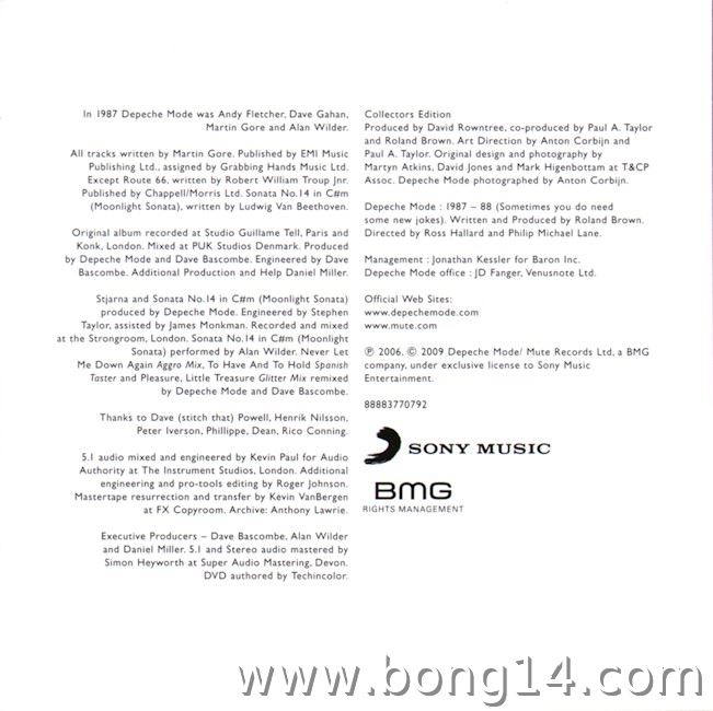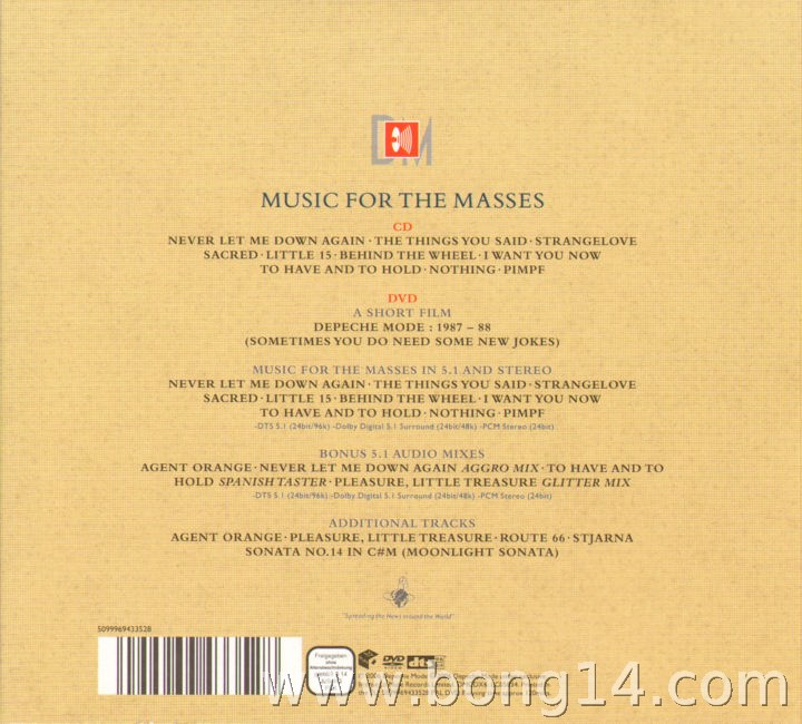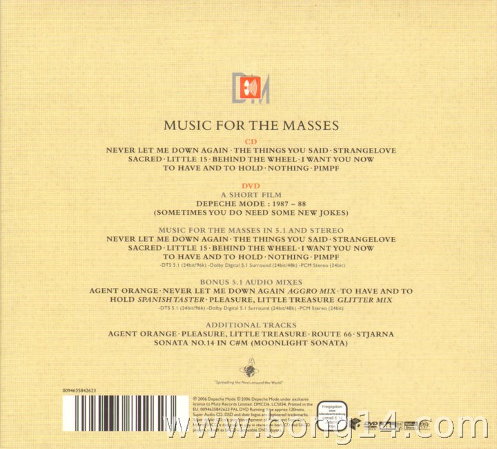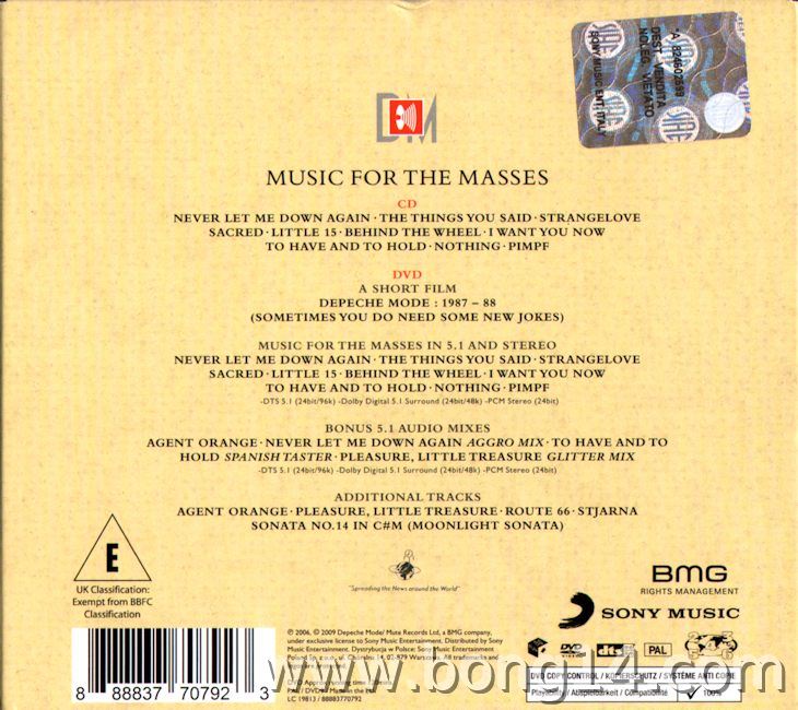 CD/393: Depeche Mode - Music For The Masses (SACD + DVD) - EU - 2006 - Mute Records - DMCD6 - 0094635842623Matrixcode SACD: Sonopress 51807575/3585602 21 Sonopress 51807574/3584262 D22Matrixcode DVD: www.mediamotion.com 3584269-1 PAL @ 2 020104 0201011: Never Let Me Down Again (SACD) - 00:002: The Things You SAid (SACD) - 00:003: Strangelove (SACD) - 00:004: Sacred (SACD) - 00:005: Little 15 (SACD) - 00:006: Behind The Wheel (SACD) - 00:007: I Want You Now (SACD) - 00:008: To Have And To Hold (SACD) - 00:009: Nothing (SACD) - 00:0010: Pimpf (SACD) - 00:0020: A Short Film: 1987-88 (Sometimes You Do Need Some - 00:0021: Music For The Masses in 5.1 (dts+dd) and Stereo (D - 00:0022: Agent Orange (5.1 and Stereo) (DVD) - 00:0023: Never Let Me Down Again (Aggro Mix) (5.1 and Stere - 00:0024: To Have And To Hold (Spanish Taster) (5.1 and Ster - 00:0025: Pleasure, Little Treasure (Glitter Mix) (5.1 and S - 00:0026: Agent Orange (DVD) - 00:0027: Pleasure, Little Treasure (DVD) - 00:0028: Route 66 (DVD) - 00:0029: Stjarna (DVD) - 00:0030: Sonata No.14 in C#M (Moonlight Sonata) (DVD) - 00:00 |