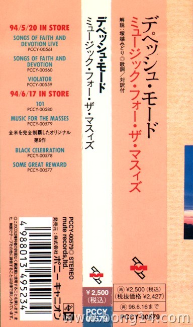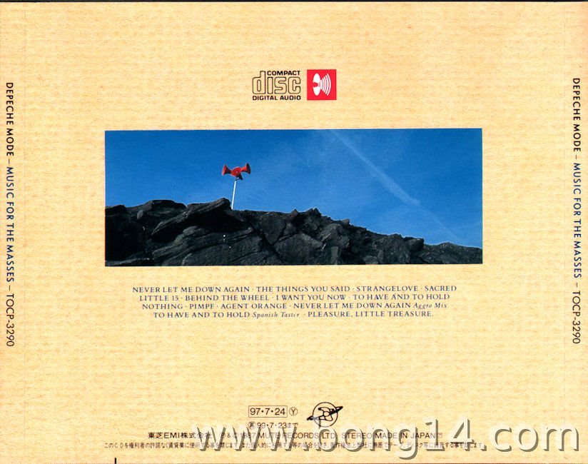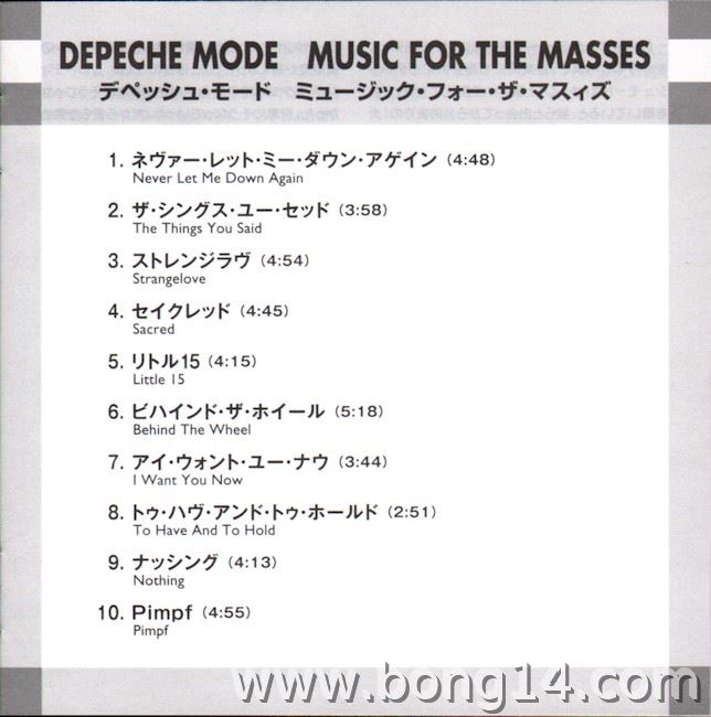 CD/837: Depeche Mode - Music For The Masses - Japan - 1994 - Pony Canyon - PCCY-00579 - 4988013495234Matrixcode CD1: PCCY-00579 21: Never Let Me Down Again - 00:002: The Things You Said - 00:003: Strangelove - 00:004: Sacred - 00:005: Little 15 - 00:006: Behind The Wheel - 00:007: I Want You Now - 00:008: To Have And To Hold - 00:009: Nothing - 00:0010: Pimpf - 00:0011: Agent Orange - 00:0012: Never Let Me Down Again (Aggro Mix) - 00:0013: To Have And To Hold (Spanish Taster) - 00:0014: Pleasure, Little Treasure (Glitter Mix) - 00:00 |
