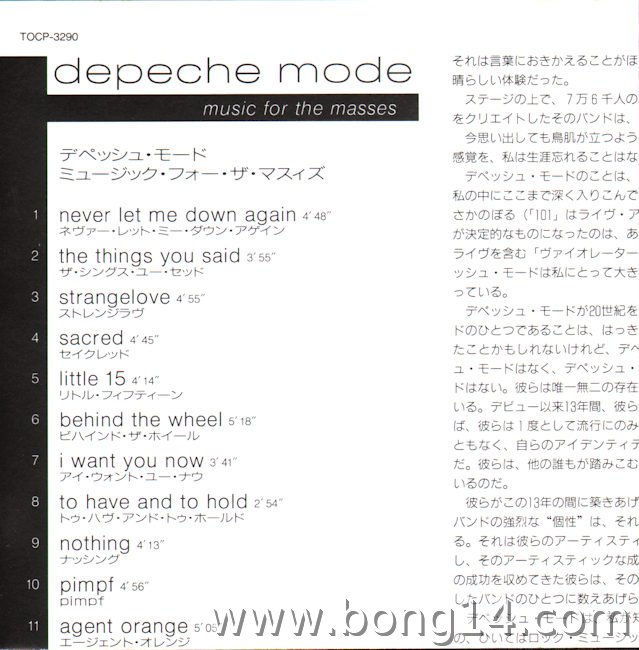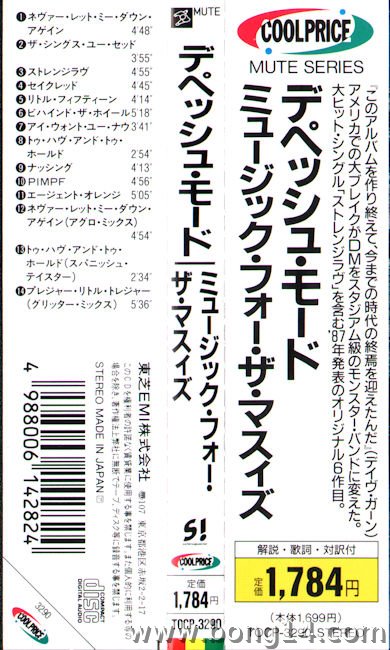 CD/1020: Depeche Mode - Music For The Masses - Japan - 1987 - Mute Records - TOCP-3290 - 4988006142824Matrixcode CD: TOCP-3290 1 A11: Never Let Me Down Again - 00:002: The Things You Said - 00:003: Strangelove - 00:004: Sacred - 00:005: Little 15 - 00:006: Behind The Wheel - 00:007: I Want You Now - 00:008: To Have And To Hold - 00:009: Nothing - 00:0010: Pimpf - 00:0011: Agent Orange - 00:0012: Never Let Me Down Again (Aggro Mix) - 00:0013: To Have And To Hold (Spanish Taster) - 00:0014: Pleasure, Little Treasure (Glitter Mix) - 00:00 |