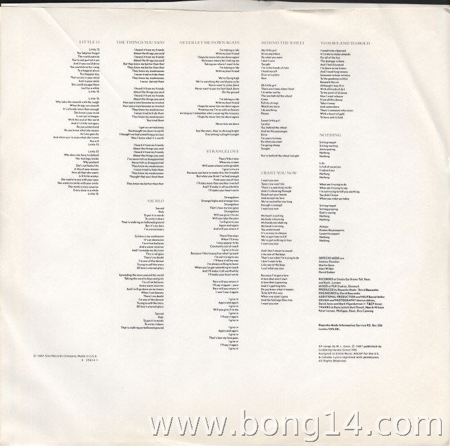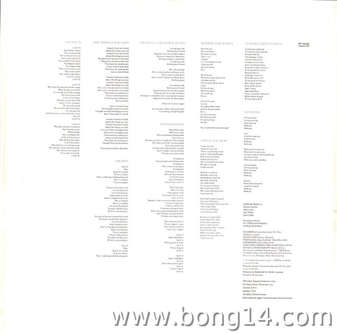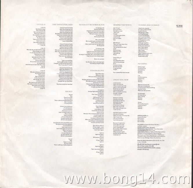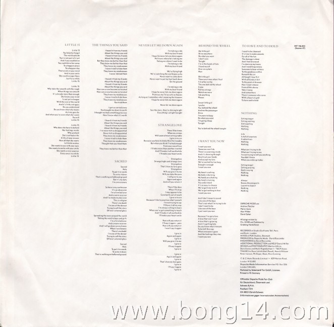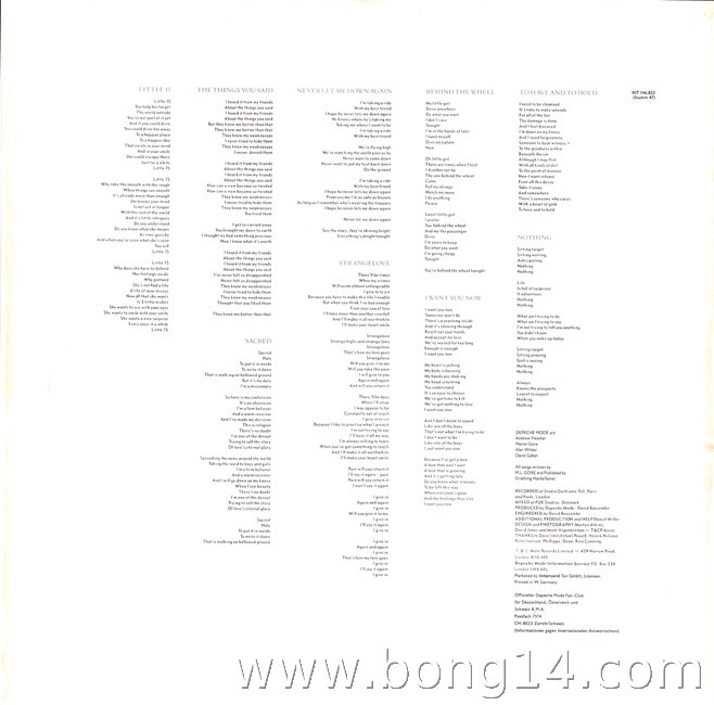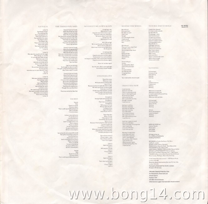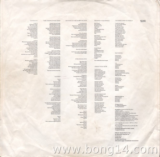 sleeve without speakerMatrixcode Seite 1: DMM B-9335 A-1/8-87 IIMatrixcode Seite 2: DMM B-9335 B-1/8-87 IV1: Never Let Me Down Again - 00:002: The Things You Said - 00:003: Strangelove - 00:004: Sacred - 00:005: Little 15 - 00:006: Behind The Wheel - 00:007: I Want You Now - 00:008: To Have And To Hold - 00:009: Nothing - 00:0010: Pimpf - 00:00 |