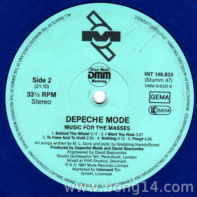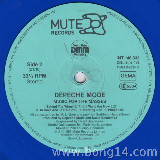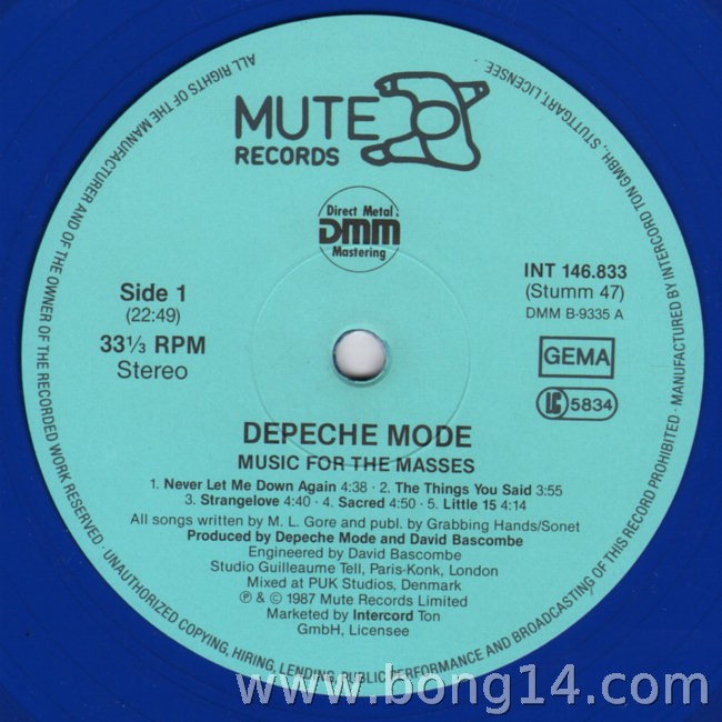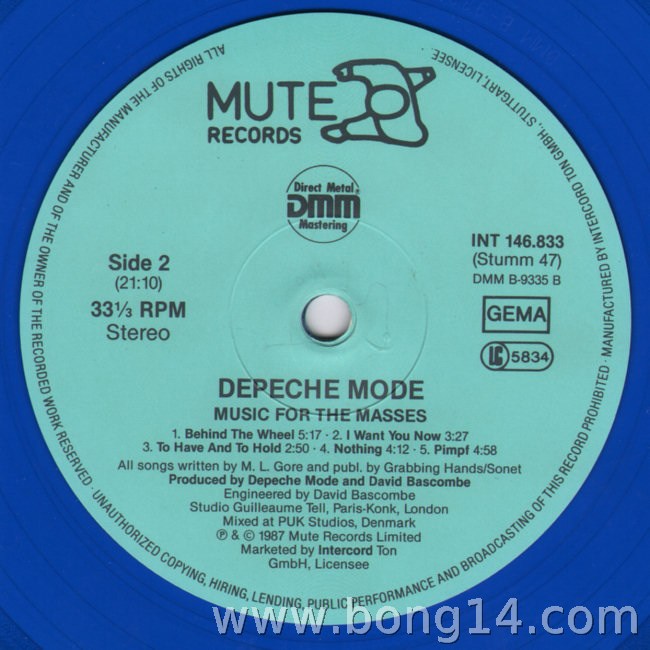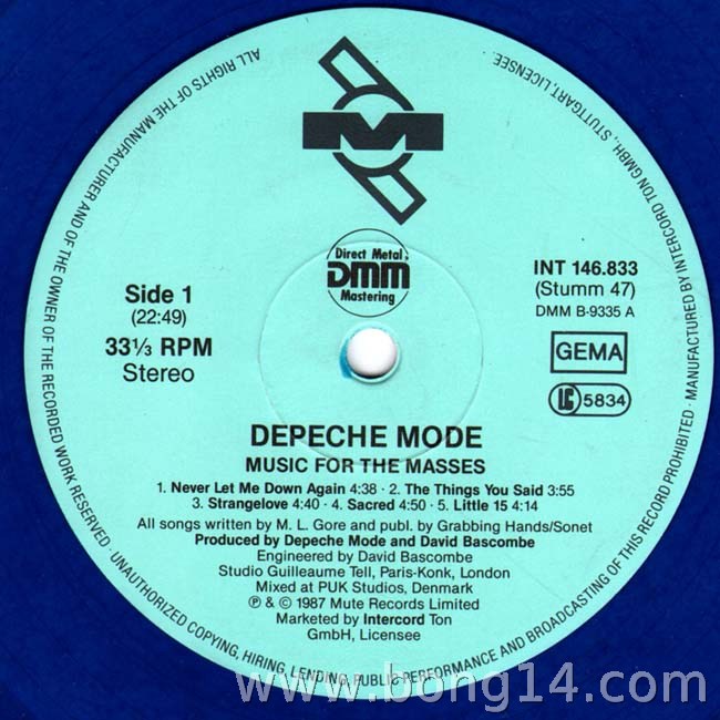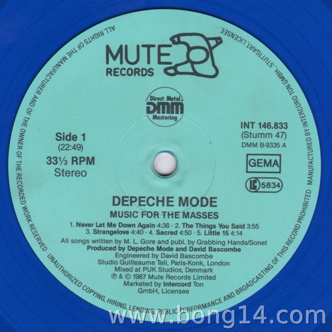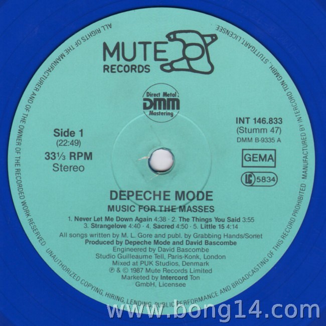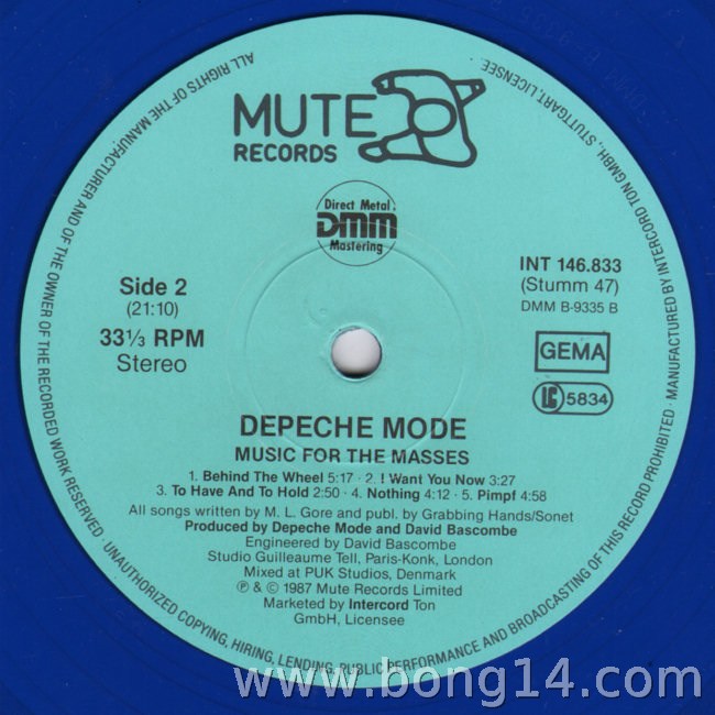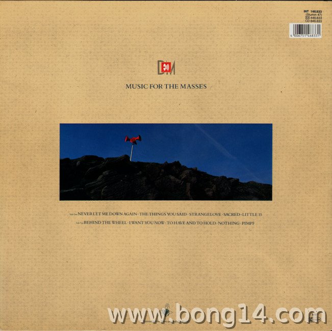 LP/232: Depeche Mode - Music For The Masses (Blue Vinyl) - Deutschland - 1987 - Mute Records - INT 146.833 - 4006751468331blue vinyl Logo 1 sleeve without speaker blue sticker1: Never Let Me Down Again - 00:002: The Things You Said - 00:003: Strangelove - 00:004: Sacred - 00:005: Little 15 - 00:006: Behind The Wheel - 00:007: I Want You Now - 00:008: To Have And To Hold - 00:009: Nothing - 00:0010: Pimpf - 00:00 |