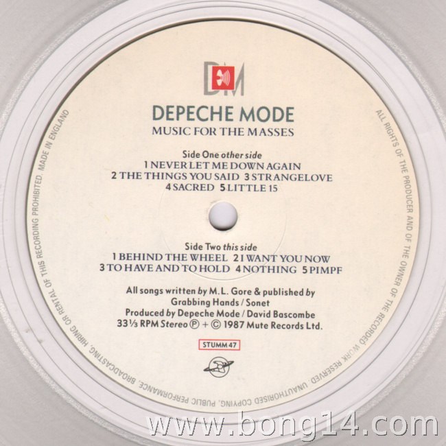 LP/141: Depeche Mode - Music For The Masses (Clear Vinyl) - Grossbritannien - 1987 - Mute Records - STUMM47 - 5016025300471Clear VinylMatrixcode Seite 1: STUMM47 A1X THE EXCHANGE COREY! YOU'RE SO JAZZ MPOMatrixcode Seite 2: STUMM47 B1X JONZ MPO1: Never Let Me Down Again - 00:002: The Things You Said - 00:003: Strangelove - 00:004: Sacred - 00:005: Little 15 - 00:006: Behind The Wheel - 00:007: I Want You Now - 00:008: To Have And To Hold - 00:009: Nothing - 00:0010: Pimpf - 00:00 |