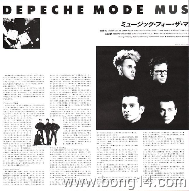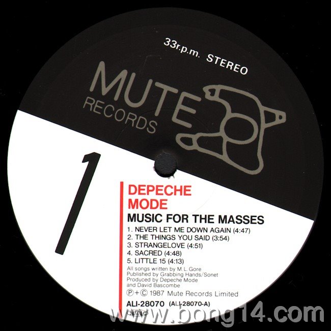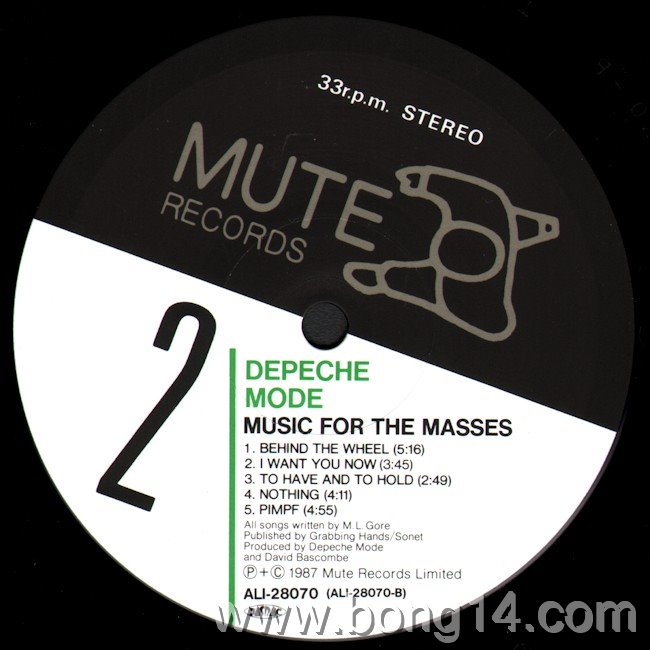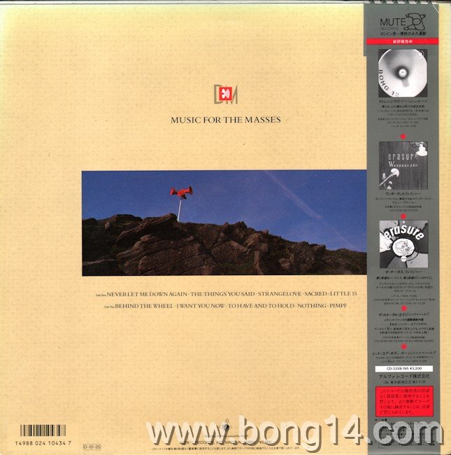 LP/319: Depeche Mode - Music For The Masses - Japan - 1987 - Alfa Records - ALI-28070 - 4988024104347Matrixcode Seite 1: ALI-28070-A TO 7-Y 1-A-4 3 OMatrixcode Seite 2: ALI-28070-B TO 2-A-3 3 O1: Never Let Me Down Again - 04:382: The Things You Said - 03:553: Strangelove - 04:404: Sacred - 04:505: Little 15 - 04:146: Behind The Wheel - 05:177: I Want You Now - 03:278: To Have And To Hold - 02:509: Nothing - 04:1210: Pimpf - 04:58 |