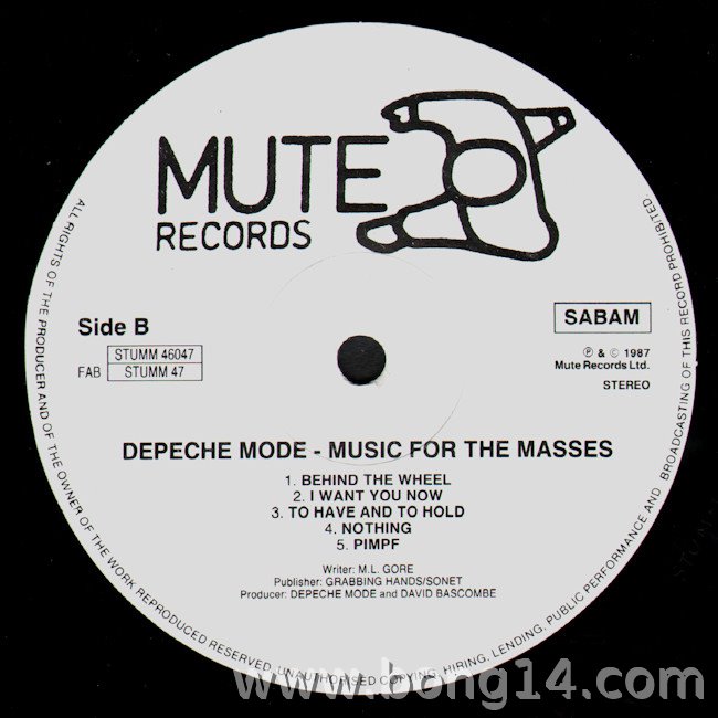 LP/384: Depeche Mode - Music For The Masses - Belgien - 1987 - Mute Records - STUMM46047 - -Matrixcode Seite 1: STUMM 46047-A1 XJ COONMatrixcode Seite 2: STUMM 46047-B2 EAo FOON1: Never Let Me Down Again - 00:002: The Things You Said - 00:003: Strangelove - 00:004: Sacred - 00:005: Little 15 - 00:006: Behind The Wheel - 00:007: I Want You Now - 00:008: To Have And To Hold - 00:009: Nothing - 00:0010: Pimpf - 00:00 |