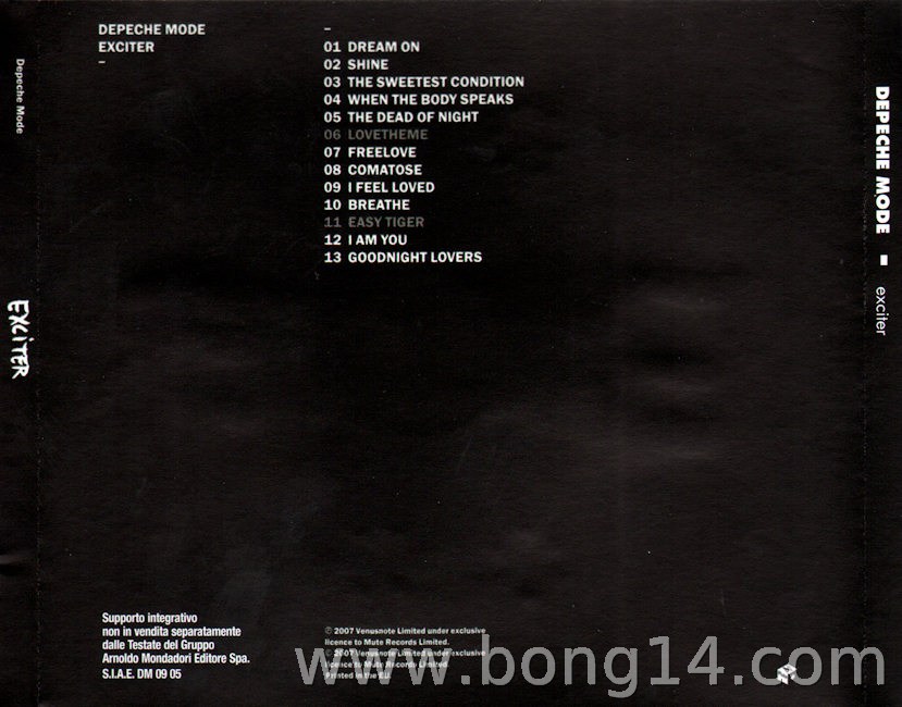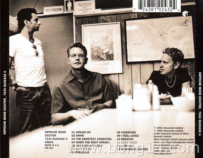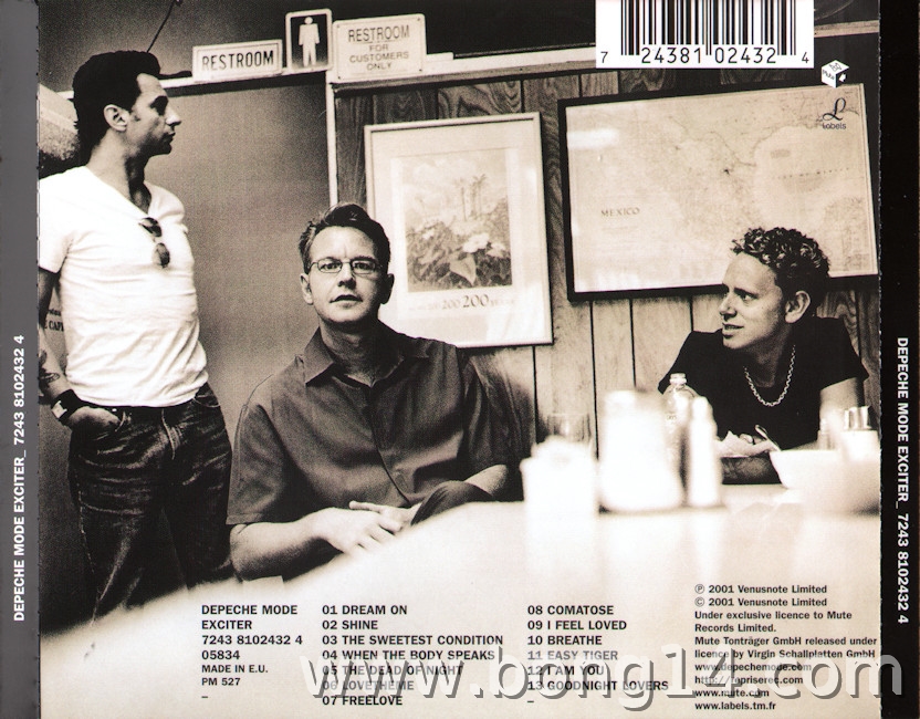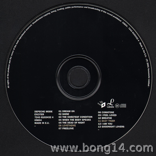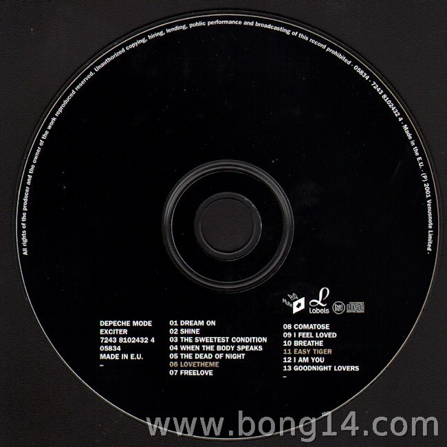 CD/146: Depeche Mode - Exciter - EU - 2001 - Mute Records - 7243 8102432 4 - 724381024324Matrixcode CD: EMI UDEN 8102432 @ 1 1-1-15-NL1: Dream On - 00:002: Shine - 00:003: The Sweetest Condition - 00:004: When The Body Speaks - 00:005: The Dead Of Night - 00:006: Lovetheme - 00:007: Freelove - 00:008: Comatose - 00:009: I Feel Loved - 00:0010: Breathe - 00:0011: Easy Tiger - 00:0012: I Am You - 00:0013: Goodnight Lovers - 00:00 |