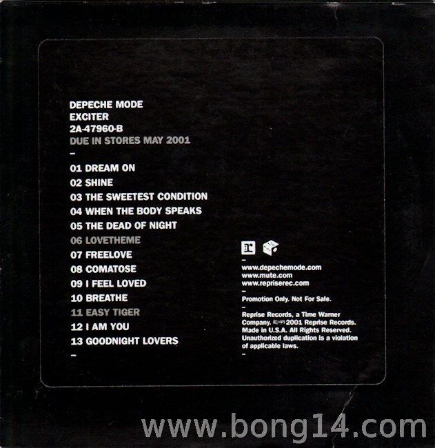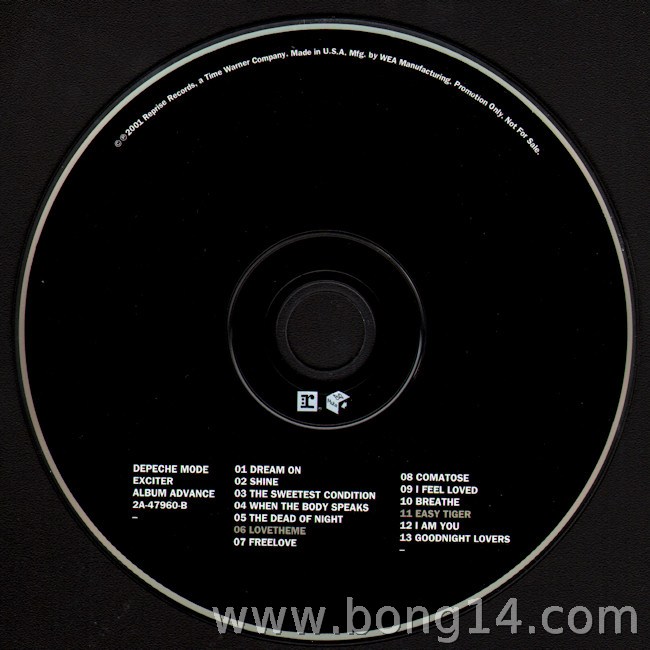 CD/363: Depeche Mode - Exciter (Promo) - USA - 2001 - Reprise Records - 2A-47960-B - -Matrixcode CD: X15654 1 47960-2 01 M1S21: Dream On - 00:002: Shine - 00:003: The Sweetest Condition - 00:004: When The Body Speaks - 00:005: The Dead Of Night - 00:006: Lovetheme - 00:007: Freelove - 00:008: Comatose - 00:009: I Feel Loved - 00:0010: Breathe - 00:0011: Easy Tiger - 00:0012: I Am You - 00:0013: Goodnight Lovers - 00:00 |