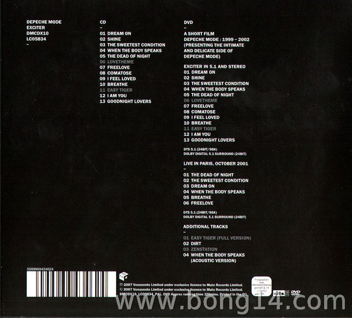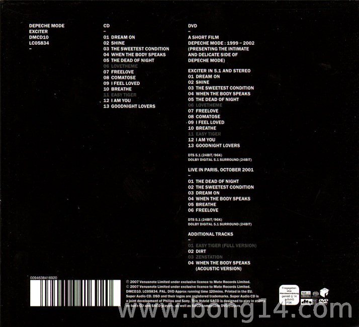 CD/509: Depeche Mode - Exciter (SACD + DVD) - EU - 2007 - Mute Records - DMCD10 - 0094638417026Matrixcode SACD: A0100824743-A911 27 A0 A0100824743-B911 18 A1Matrixcode DVD: WWW.MEDIAMOTION.COM 3841699-0 PAL @1 010101 WWW.MEDIAMOTION.COM 3841699-1 PAL @1 0101021: Dream On - 00:002: Shine - 00:003: The Sweetest Condition - 00:004: Whe The Body Speaks - 00:005: The Dead Of Nighht - 00:006: Lovetheme - 00:007: Freelove - 00:008: Comatose - 00:009: I Feel Loved - 00:0010: Breathe - 00:0011: Easy Tiger - 00:0012: I Am You - 00:0013: Goodnight Lovers - 00:0021: A Short Film: Depeche Mode 1999-2002 (Presenting T - 00:0022: Exciter in 5.1 and stereo - 00:0023: The Dead Of Night (Live) - 00:0024: The Sweetest Condition (Live) - 00:0025: Dream On (Live) - 00:0026: When The Body Speaks (Live) - 00:0027: Breathe (Live) - 00:0028: Freelove (Live) - 00:0029: Easy Tiger (Full Version) - 00:0030: Dirt - 00:0031: Zenstation - 00:0032: When The Body Speaks (Accoustic Version) - 00:00 |