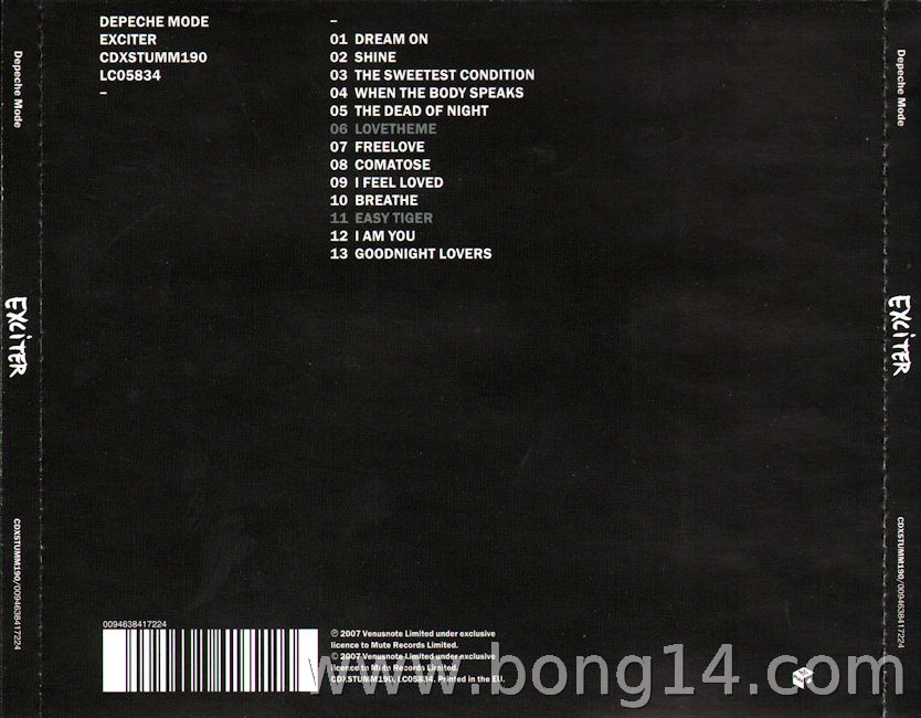 CD/613: Depeche Mode - Exciter (Remastered) - EU - 2007 - Mute Records - CDXSTUMM190 - 0094638417224Matrixcode CD: www.mediamotion.com 3841722 @ 21: Dream On - 00:002: Shine - 00:003: The Sweetest Condition - 00:004: When The Body Speaks - 00:005: The Dead Of Night - 00:006: Lovetheme - 00:007: Freelove - 00:008: Comatose - 00:009: I Feel Loved - 00:0010: Breathe - 00:0011: Easy Tiger - 00:0012: I Am You - 00:0013: Goodnight Lovers - 00:00 |