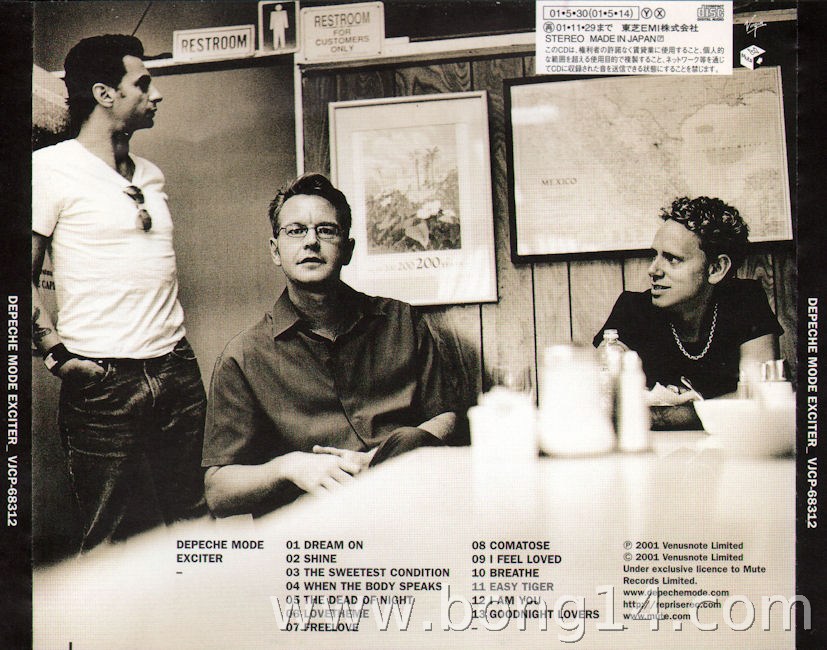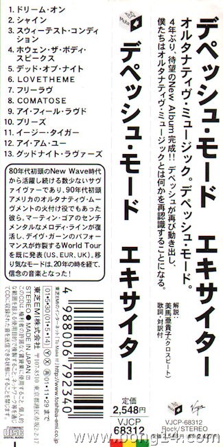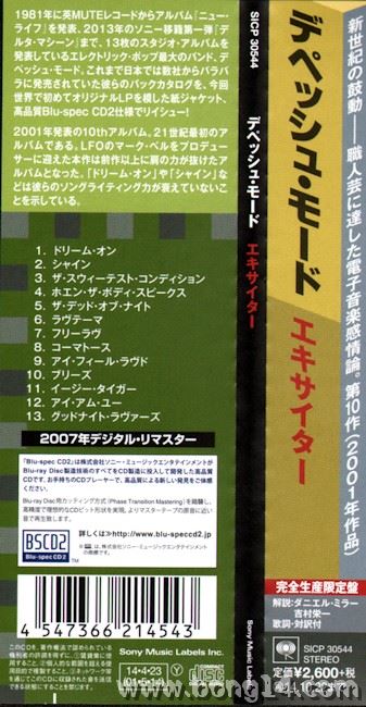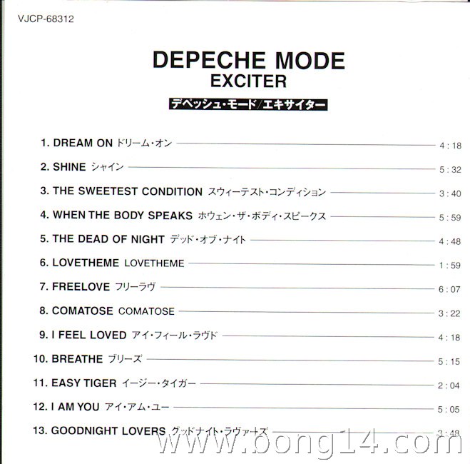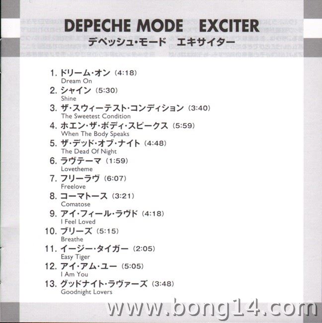 CD/944: Depeche Mode - Exciter - Japan - 2014 - Sony Music Entertainment - SICP 30544 - 4547366214543Matrixcode CD: SICP-30544 11: Dream On - 00:002: Shine - 00:003: The Sweetest Condition - 00:004: When The Body Speaks - 00:005: The Dead Of Night - 00:006: Lovetheme - 00:007: Freelove - 00:008: Comatose - 00:009: I Feel Loved - 00:0010: Breathe - 00:0011: Easy Tiger - 00:0012: I Am You - 00:0013: Goodnight Lovers - 00:00 |