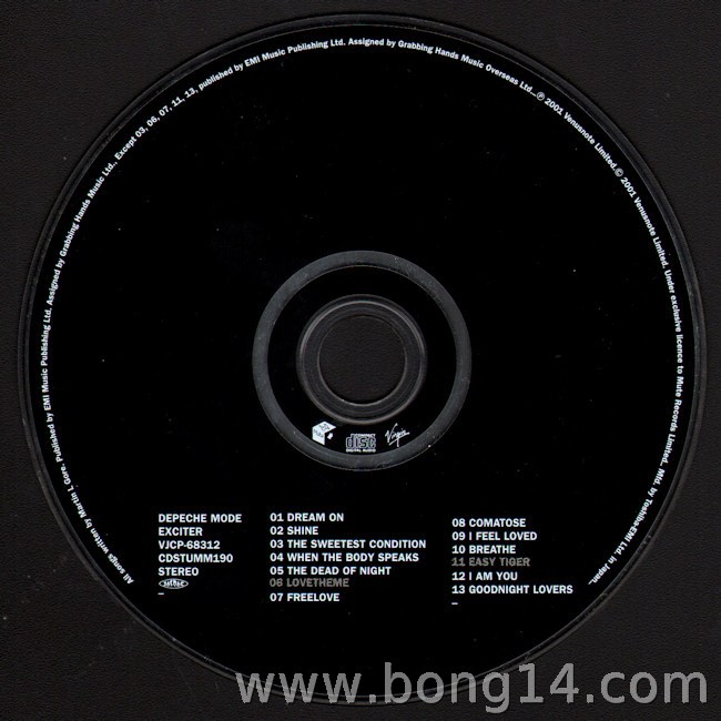 CD/815: Depeche Mode - Exciter - Japan - 2001 - Toshiba EMI - VJCP-68312 - 4988006792340Matrixcode CD: VJCP-68312 1 A11: Dream On - 00:002: Shine - 00:003: The Sweetest Condition - 00:004: When The Body Speaks - 00:005: The Dead Of Night - 00:006: Lovetheme - 00:007: Freelove - 00:008: Comatose - 00:009: I Feel Loved - 00:0010: Breathe - 00:0011: Easy Tiger - 00:0012: I Am You - 00:0013: Goodnight Lovers - 00:00 |