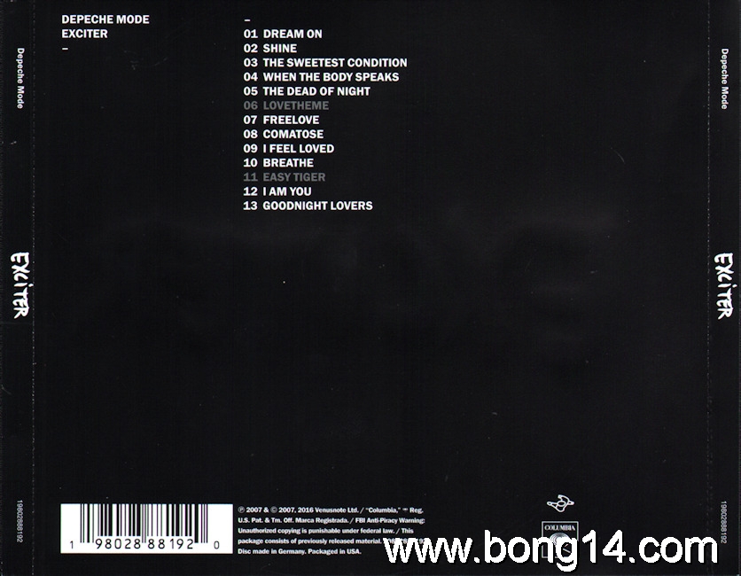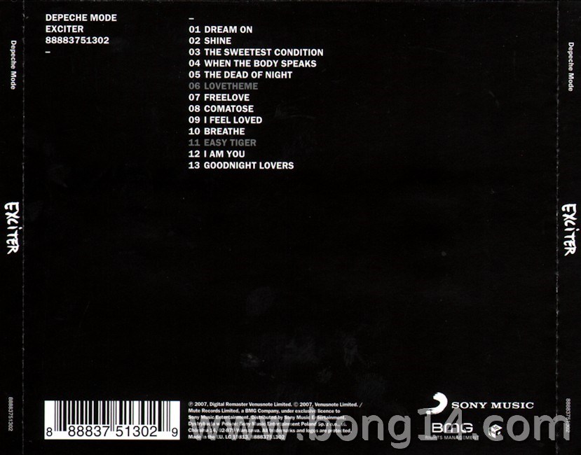 CD/894: Depeche Mode - Exciter - EU - 2013 - Sony Music Entertainment - 88883751302 - 888837513029Matrixcode CD: A0102157196-0101 15 A001: Dream On - 00:002: Shine - 00:003: The Sweetest Condition - 00:004: When The Body Speaks - 00:005: The Dead Of Night - 00:006: Lovetheme - 00:007: Freelove - 00:008: Comatose - 00:009: I Feel Loved - 00:0010: Breathe - 00:0011: Easy Tiger - 00:0012: I Am You - 00:0013: Goodnight Lovers - 00:00 |