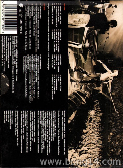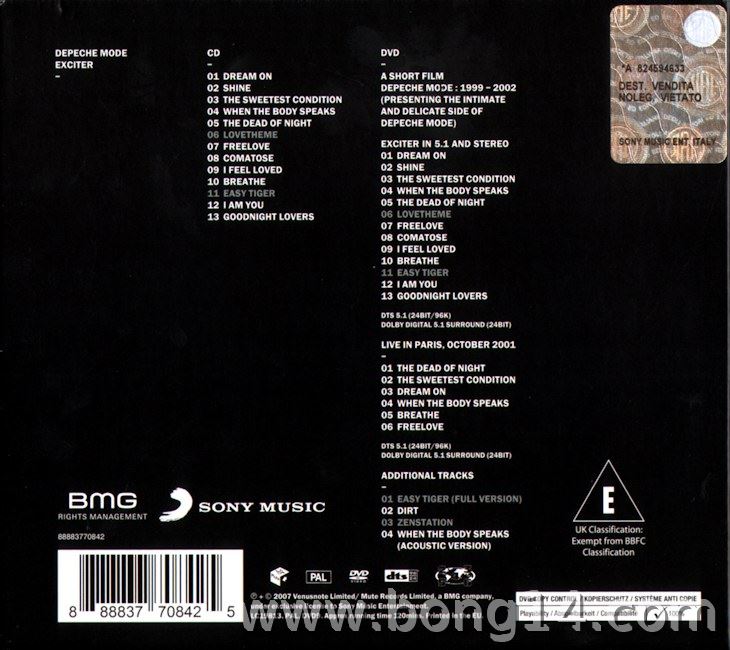 Matrixcode CD: A0102178462-0102 37 A00Matrixcode DVD: A0102178941-A922 26 A00 / A0102178941-B922 21 A00Mould SID Code(CD): IFPI 94K1Mastering SID Code(CD): IFPI L557Mould SID Code(DVD): IFPI945VMastering SID Code(DVD layer 0): IFPI L556Mastering SID Code(DVD layer 1): IFPI L5511: Dream On - 00:002: Shine - 00:003: The Sweetest Condition - 00:004: Whe The Body Speaks - 00:005: The Dead Of Nighht - 00:006: Lovetheme - 00:007: Freelove - 00:008: Comatose - 00:009: I Feel Loved - 00:0010: Breathe - 00:0011: Easy Tiger - 00:0012: I Am You - 00:0013: Goodnight Lovers - 00:0021: A Short Film: Depeche Mode 1999-2002 (Presenting T - 00:0022: Exciter in 5.1 and stereo - 00:0023: The Dead Of Night (Live) - 00:0024: The Sweetest Condition (Live) - 00:0025: Dream On (Live) - 00:0026: When The Body Speaks (Live) - 00:0027: Breathe (Live) - 00:0028: Freelove (Live) - 00:0029: Easy Tiger (Full Version) - 00:0030: Dirt - 00:0031: Zenstation - 00:0032: When The Body Speaks (Accoustic Version) - 00:00 |