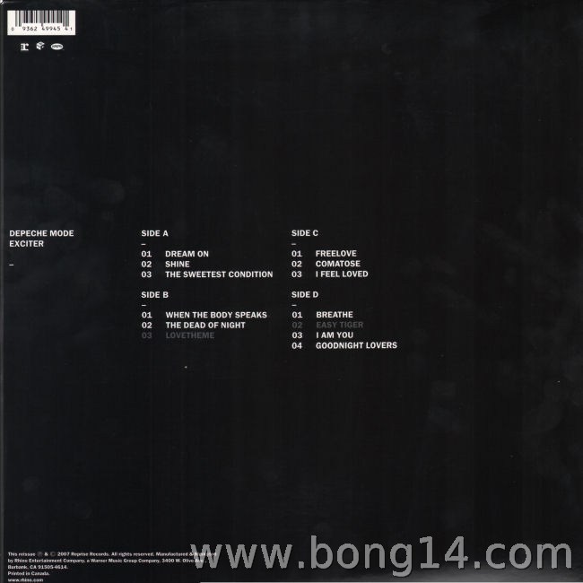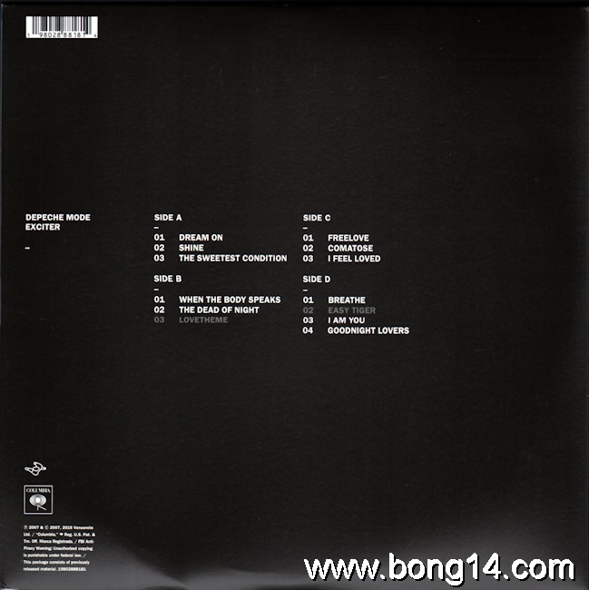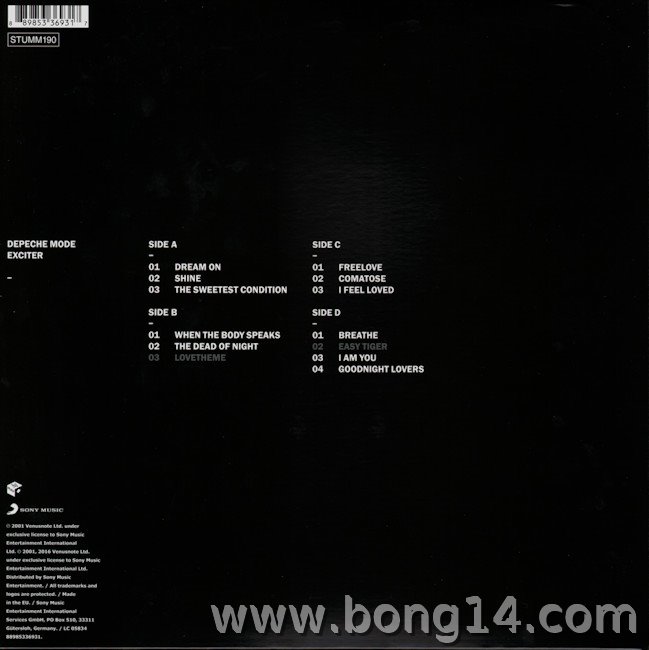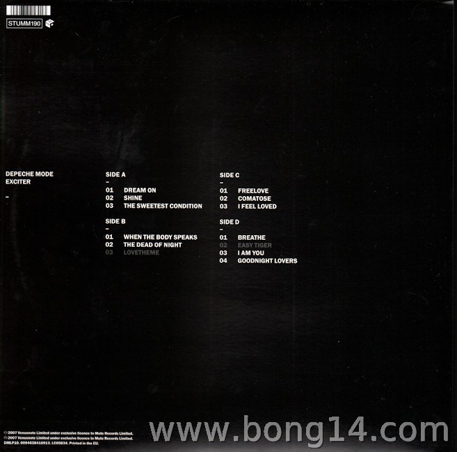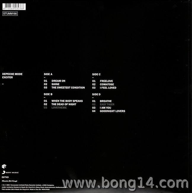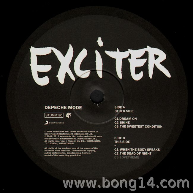 LP/348: Depeche Mode - Exciter - EU - 2017 - Sony Music Entertainment - STUMM190 - 889853369312LPMatrixcode Seite 1: MIKE'S THE EXCHANGE 07 REMASTA XXXXX 1A XXXXXXX X XXXXXXX 97342 1A MOVLP949Matrixcode Seite 2: XXXXX 1B XXXXXXX X XXXXXXX MIKE'S THE EXCHANGE 07 REMASTA 97342 1B MOVLP949Matrixcode Seite 3: MIKE'S THE EXCHANGE 07 REMASTA XXXXX 1C XXXXXXX X XXXXXXX 97342 C MOVLP949Matrixcode Seite 4: MIKE'S THE EXCHANGE 07 REMASTA XXXXX 1D XXXXXXX X XXXXXXX 97342 D MOVLP9491: Dream On - 00:002: Shine - 00:003: The Sweetest Condition - 00:004: When The Body Speaks - 00:005: The Dead Of Night - 00:006: Lovetheme - 00:007: Freelove - 00:008: Comatose - 00:009: I Feel Loved - 00:0010: Breathe - 00:0011: Easy Tiger - 00:0012: I Am You - 00:0013: Goodnight Lovers - 00:00 |