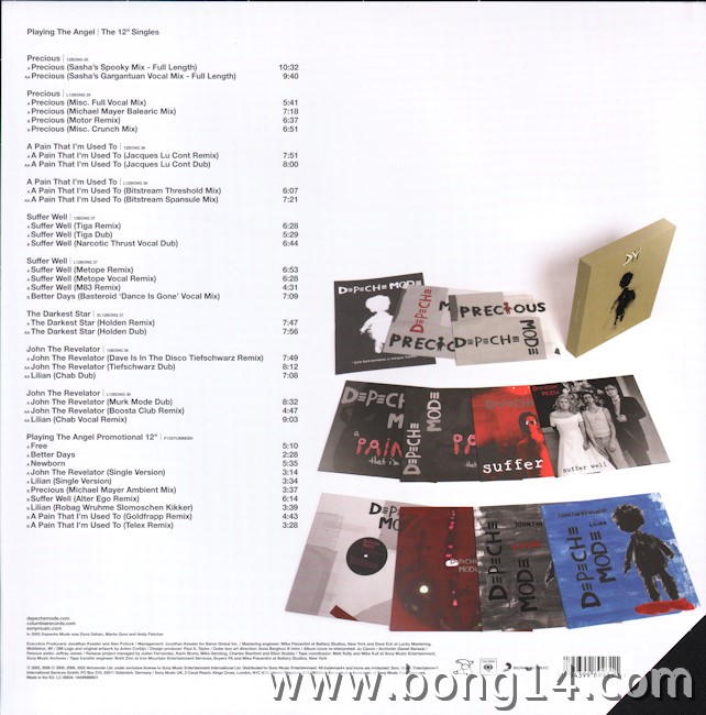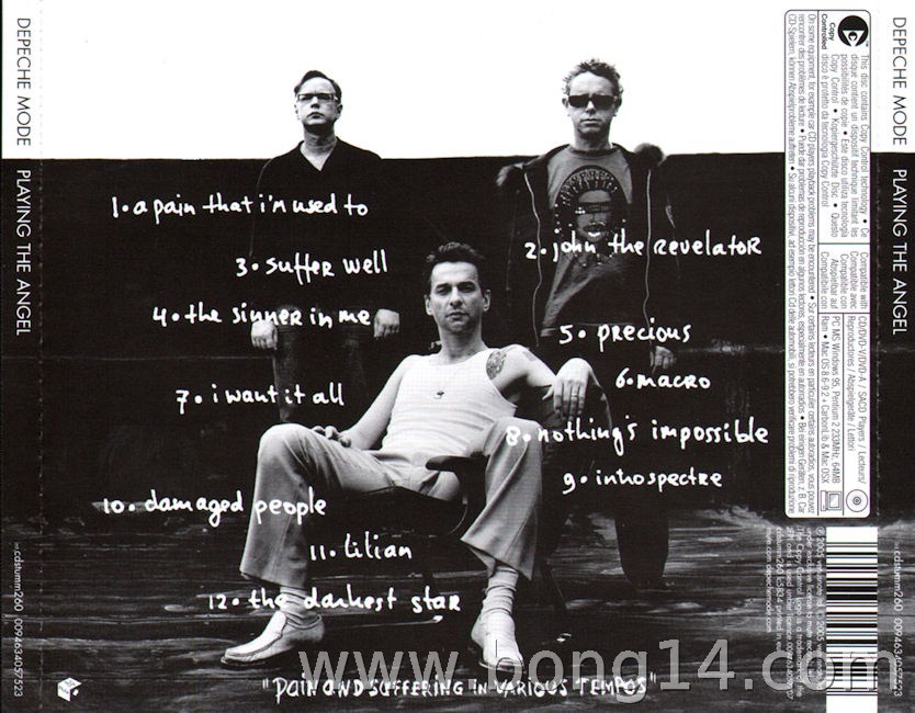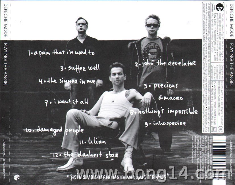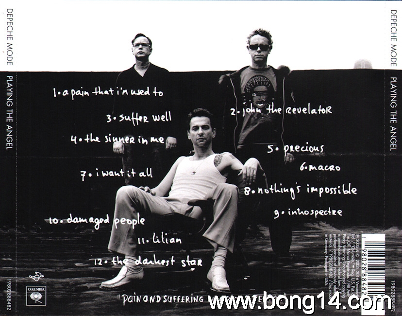 CD/923: Depeche Mode - Playing The Angel - EU - 2013 - Sony Music Entertainment - 88883750842 - 888837508421Matrixcode CD: A0102153796-0101 25 A001: A Pain That I'm Used To - 00:002: John The Revelator - 00:003: Suffer Well - 00:004: The Sinner In Me - 00:005: Precious - 00:006: Macro - 00:007: I Want It All - 00:008: Nothing's Impossible - 00:009: Introspectre - 00:0010: Damaged People - 00:0011: Lilian - 00:0012: The Darkest Star - 00:00 |