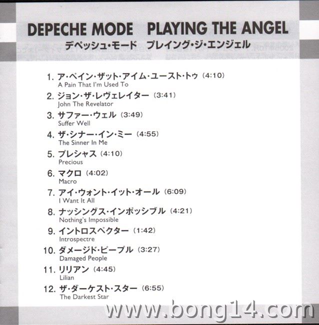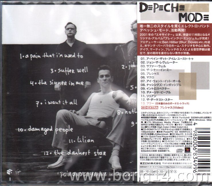 CD/379: Depeche Mode - Playing The Angel - Japan - 2005 - Toshiba EMI - TOCP-66471 - 4988006834996sealed1: A Pain That I'm Used To - 00:002: John The Revelator - 00:003: Suffer Well - 00:004: The Sinner In Me - 00:005: Precious - 00:006: Macro - 00:007: I Want It All - 00:008: Nothing's Impossible - 00:009: Introspectre - 00:0010: Damaged People - 00:0011: Lilian - 00:0012: The Darkest Star - 00:0013: Free - 00:0014: Precious (Video) - 00:00 |