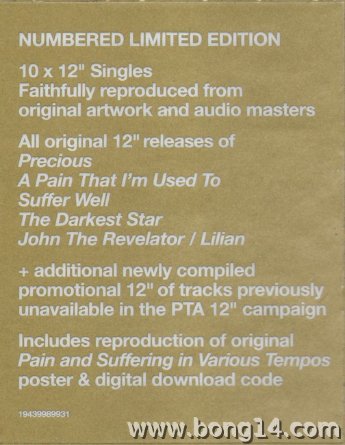 MX/1781: Depeche Mode - Playing The Angel | The 12" Singles - EU - 2022 - Columbia - 12DMBOX11 - 194399899311Matrixcode PREC Seite 1: 12 BONG 35-A 19439989931-A 1208823 242333E1 ⓁMatrixcode PREC Seite 2: 12 BONG 35 B 19439989931-B 1208825 242333E2 LuckyMatrixcode PRECL Seite 1: 19439989931-C-1 L12BONG35-C-1 1254990 244909E3 ⓁMatrixcode PRECL Seite 2: L12BONG35-D 19439989931-D 1334731 242333E4 LuckyMatrixcode APTIUT Seite 1: 19439989931-E-1 12BONG36-E-1 1319938 244910M5 ⓁMatrixcode APTIUT Seite 2: 12BONG36-F Lucky 1318841 242333M6Matrixcode APTIUTL Seite 1: L12BONG 36-G 1337664 242333M7 ⓁMatrixcode APTIUTL Seite 2: L12BONG36-H Lucky 1346314 242333M8Matrixcode SW Seite 1: 12BONG37-I 19439989931-I 1208812 242333E9 ⓁMatrixcode SW Seite 2: 12BONG37-J 19439989931-J Lucky 1208814 242333E10Matrixcode SWL Seite 1: L12 BONG37-K 19439989931-A 1319939 242333E11 ⓁMatrixcode SWL Seite 2: L12BONG 37-L Lucky 19439989931-L 1319557 242333E12Matrixcode SWXL Seite 1: XL12BONG 37-M 19439989931-M 1335535 242333M13 ⓁMatrixcode SWXL Seite 2: XL12BONG 37-N Lucky 19439989931-N 1318647 242333M14Matrixcode JTR Seite 1: 12BONG38-O 19439989931-O Ⓛ 1334497 242333E15Matrixcode JTR Seite 2: 12BONG38-P Lucky 19439989931-P 1320293 242333E16Matrixcode JTRL Seite 1: L12BONG38-Q 19439989931-Q 1208944 242333E17 ⓁMatrixcode JTRL Seite 2: L12BONG38-R 19439989931-R Ⓛ 242333E18 1208865Matrixcode Compilation Seite 1: XL12BONG38-S 19439989931-S 1320144 242333E19 ⓁMatrixcode Compilation Seite 2: 19439989931-T1 L XL12BONG38-T-1 1324782 244911E201: Precious - 12BONG35 - 00:002: Precious - L12BONG35 - 00:003: A Pain That I'm Used To - 12BONG36 - 00:004: A Pain That I'm Used To - L12BONG36 - 00:005: Suffer Well - 12BONG37 - 00:006: Suffer Well - L12BONG37 - 00:007: The Darkest Stat - XL12BONG37 - 00:008: John The Revalator - 12BONG38 - 00:009: John The Revalator - L12BONG38 - 00:0010: Playing The Angel Promotional 12" - P12STUMM260 - 00:00 |