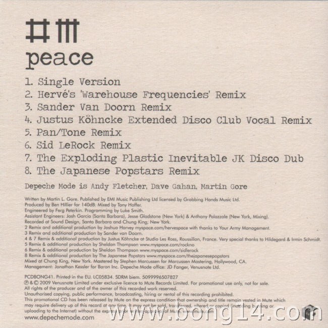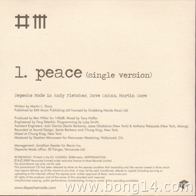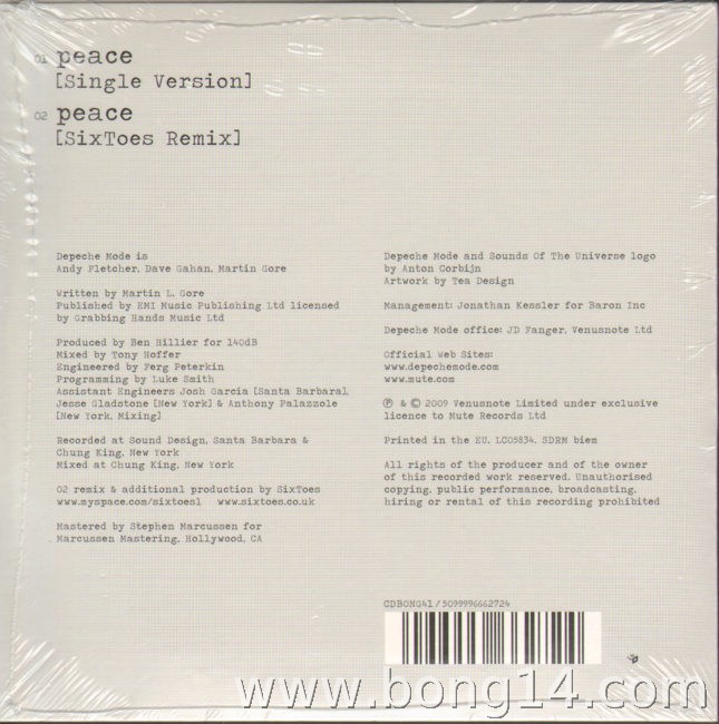 MCD/649: Depeche Mode - Peace (Promo) - EU - 2009 - Mute Records - RCDBONG41 - -1: Peace (Single Version) - 00:00 |