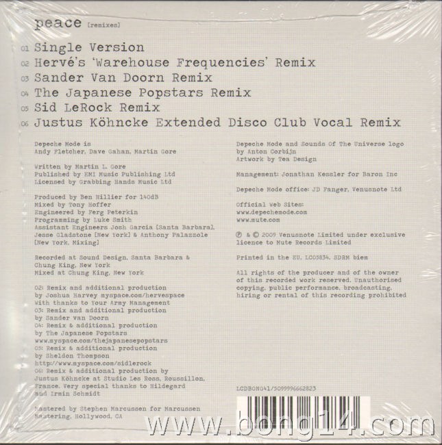 MCD/651: Depeche Mode - Peace (Limited) - EU - 2009 - Mute Records - LCDBONG41 - 5099996662823sealed1: Peace (Single Version) - 03:382: Peace (Hervé's 'Warehouse Frequencies' Remix) - 05:103: Peace (Sander van Doorn Remix) - 08:014: Peace (The Japanese Popstars Remix) - 06:415: Peace (Sid LeRock Remix) - 06:356: Peace (Justus Köhncke Extended Disco Club Vocal Remix) - 06:23 |