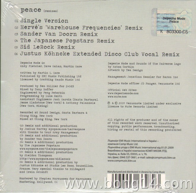 MCD/659: Depeche Mode - Peace (Limited) - Ukraine - 2009 - Mute Records - LCDBONG41 - 5099996662823sealed - ltd. to 5001: Peace (Single Version) - 03:382: Peace (Hervé's 'Warehouse Frequencies' Remix) - 05:103: Peace (Sander van Doorn Remix) - 08:014: Peace (The Japanese Popstars Remix) - 06:415: Peace (Sid LeRock Remix) - 06:356: Peace (Justus Köhncke Extended Disco Club Vocal Remix) - 06:23 |