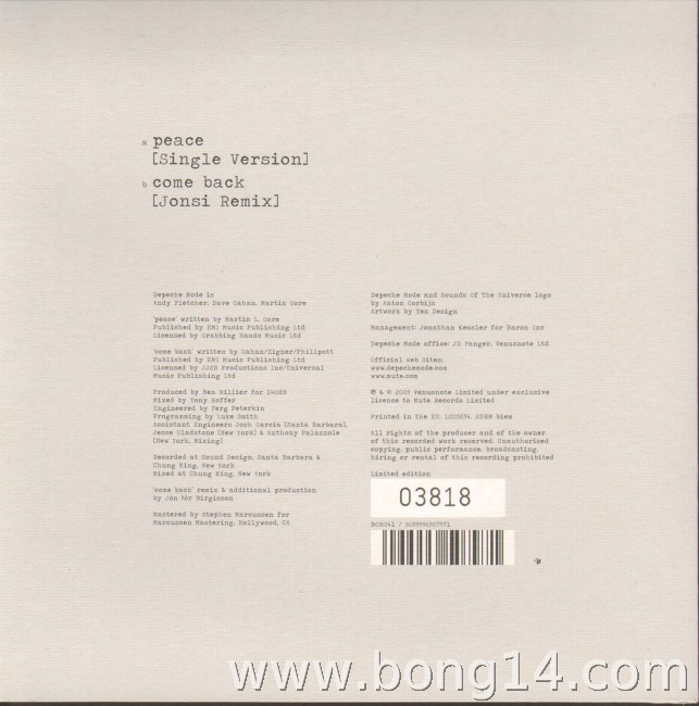 S/463: Depeche Mode - Peace (Marbled Vinyl) - EU - 2009 - Mute Records - BONG41 - 5099996507971Track 2 - Vinyl onlyMatrixcode Seite 1: B970030-01 A1 MIKE'S THE EXCHANGE1: Peace (Single Version) - 03:382: Come Back (Jonsi Remix) - 04:00 |