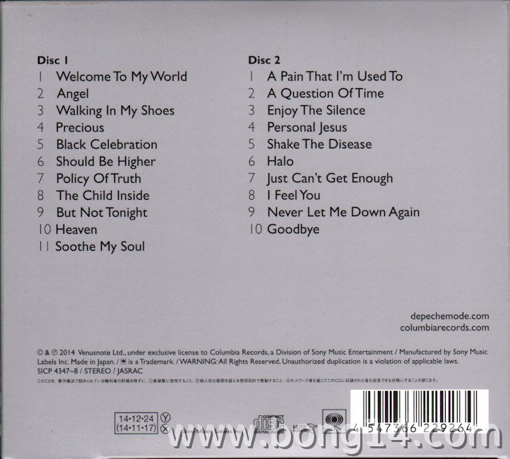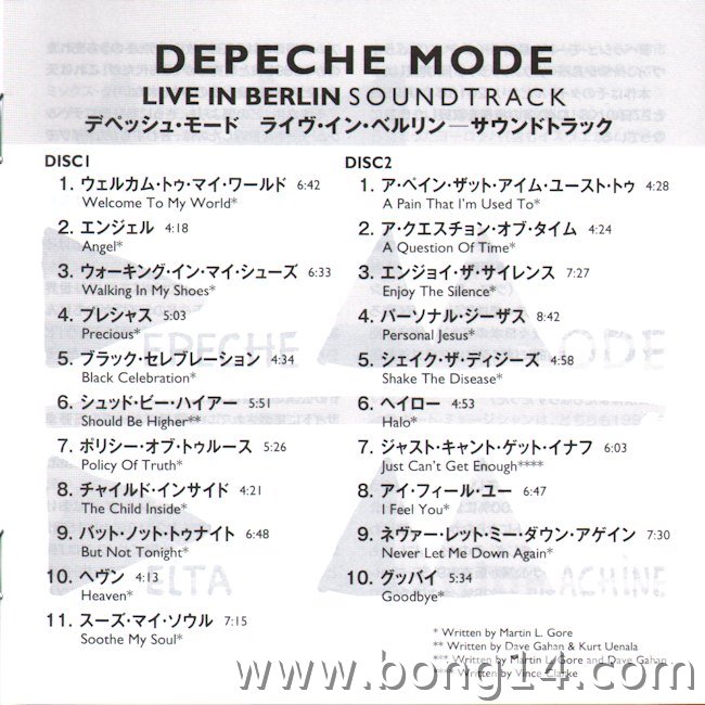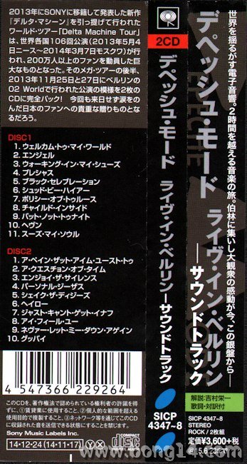 CD/975: Depeche Mode - Live in Berlin - Soundtrack - Japan - 2014 - Columbia - SICP 4347-8 - 4547366229264Matrixcode CD1: PLDA-3013 1Matrixcode CD2: PLDA-3014 11: Welcome To My World (CD1) - 00:002: Angel (CD1) - 00:003: Walking In My Shoes (CD1) - 00:004: Precious (CD1) - 00:005: Black Celebration (CD1) - 00:006: Should Be Higher (CD1) - 00:007: Policy Of Truth (CD1) - 00:008: The Child Inside (CD1) - 00:009: But Not Tonight (CD1) - 00:0010: Heaven (CD1) - 00:0011: Soothe My Soul (CD1) - 00:0012: A Pain That I'm Used To (CD2) - 00:0013: A Question Of Time (CD2) - 00:0014: Enjoy The Silence (CD2) - 00:0015: Personal Jesus (CD2) - 00:0016: Shake The Disease (CD2) - 00:0017: Halo (CD2) - 00:0018: Just Can't Get Enough (CD2) - 00:0019: I Feel You (CD2) - 00:0020: Never Let Me Down Again (CD2) - 00:0021: Goodbye (CD2) - 00:00 |