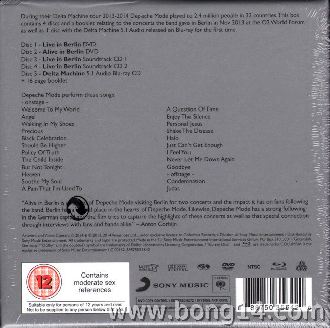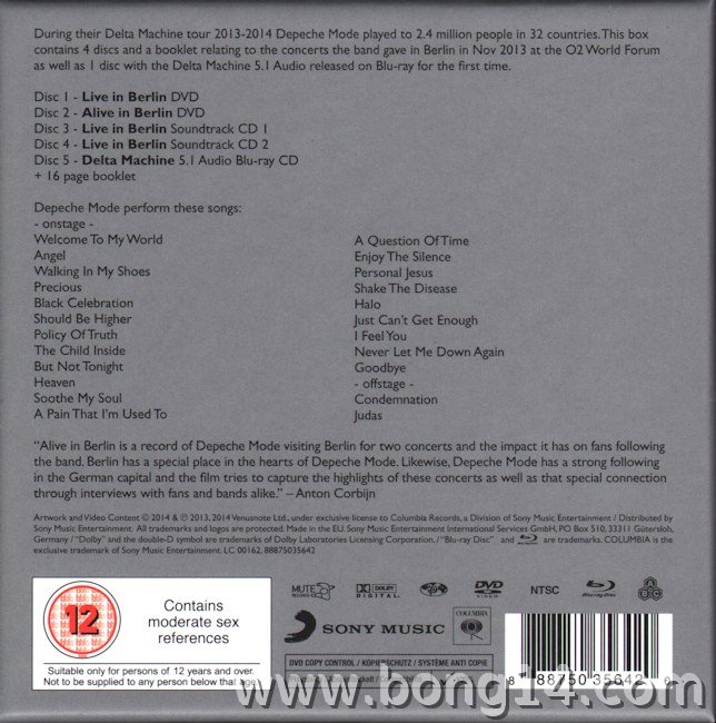 2CD "Live in Berlin"Matrixcode DVD1: A0102407784-A911 27 A00 / A0102407784-B911 16Matrixcode DVD2: A0102407785-A911 17 A00 / A0102407785-B911 16Matrixcode BD: A0102407872-A511 1000 3A00Matrixcode CD1: A0102406289-0101 15 A01Matrixcode CD2: A0102406287-0101 15 A011: Welcome To My World (DVD1+2, CD1) - 00:002: Angel (DVD1+2, CD1) - 00:003: Walking In My Shoes (DVD1+2, CD1) - 00:004: Precious (DVD1+2, CD1) - 00:005: Black Celebration (DVD1+2, CD1) - 00:006: Should Be Higher (DVD1+2, CD1) - 00:007: Policy Of Truth (DVD1+2, CD1) - 00:008: The Child Inside (DVD1+2, CD1) - 00:009: But Not Tonight (DVD1+2, CD1) - 00:0010: Heaven (DVD1+2, CD1) - 00:0011: Soothe My Soul (DVD1+2, CD1) - 00:0012: A Pain That I'm Used To (DVD1+2, CD2) - 00:0013: A Question Of Time (DVD1+2, CD2) - 00:0014: Enjoy The Silence (DVD1+2, CD2) - 00:0015: Personal Jesus (DVD1+2, CD2) - 00:0016: Shake The Disease (DVD1+2, CD2) - 00:0017: Halo (DVD1+2, CD2) - 00:0018: Just Can't Get Enough (DVD1+2, CD2) - 00:0019: I Feel You (DVD1+2, CD2) - 00:0020: Never Let Me Down Again (DVD1+2, CD2) - 00:0021: Goodbye (DVD1+2, CD2) - 00:0022: Bordello Acoustic Sessions "Condemnation" and "Judas" (DVD2) - 00:0023: 15 Interview Pieces (DVD2) - 00:0031: Welcome To My World (Bluray) - 00:0032: Angel (Bluray) - 00:0033: Heaven (Bluray) - 00:0034: Secret To The End (Bluray) - 00:0035: My Little Universe (Bluray) - 00:0036: Slow (Bluray) - 00:0037: Broken (Bluray) - 00:0038: The Child Inside (Bluray) - 00:0039: Soft Touch/Raw Nerve (Bluray) - 00:0040: Should Be Higher (Bluray) - 00:0041: Alone (Bluray) - 00:0042: Soothe My Soul (Bluray) - 00:0043: Goodbye (Bluray) - 00:0044: Long Time Lie (Bluray) - 00:0045: Happens All The Time (Bluray) - 00:0046: Always (Bluray) - 00:0047: All That's Mine (Bluray) - 00:00 |