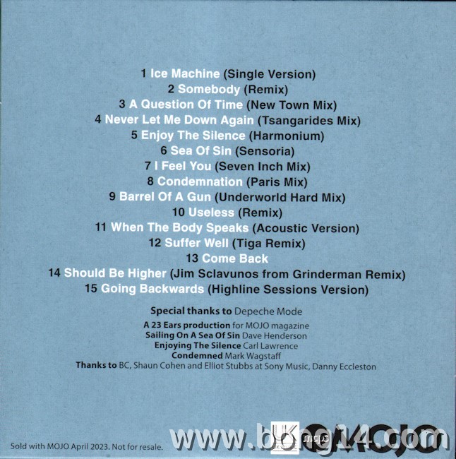 CD/1197: Depeche Mode - Classics. Rarities. Revelations - Grossbritannien - 2023 - Mojo - MOJO April 2023 - -Matrixcode CD: 2100010867315 Mojo April 20231: Ice Machine (7" Version) - 03:522: Somebody (Remix) - 04:213: A Question Of Time (New Town Mix) - 06:464: Never Let Me Down Again (Tsangarides Mix) - 04:225: Enjoy The Silence (Harmonium) - 02:426: Sea Of Sin (Sensoria) - 06:047: I Feel You (Seven Inch Mix) - 04:358: Condemnation (Paris Mix) - 03:219: Barrel Of A Gun (Underworld Hard Mix) - 09:3810: Useless (Remix) - 04:5211: When The Body Speaks (Acoustic Version) - 06:0012: Suffer Well (Tiga Remix) - 06:2713: Come Back - 05:1514: Should Be Higher (Jim Sclavunos from Grinderman Remix) - 04:1115: Going Backwards (Highline Session Version) - 05:25 |