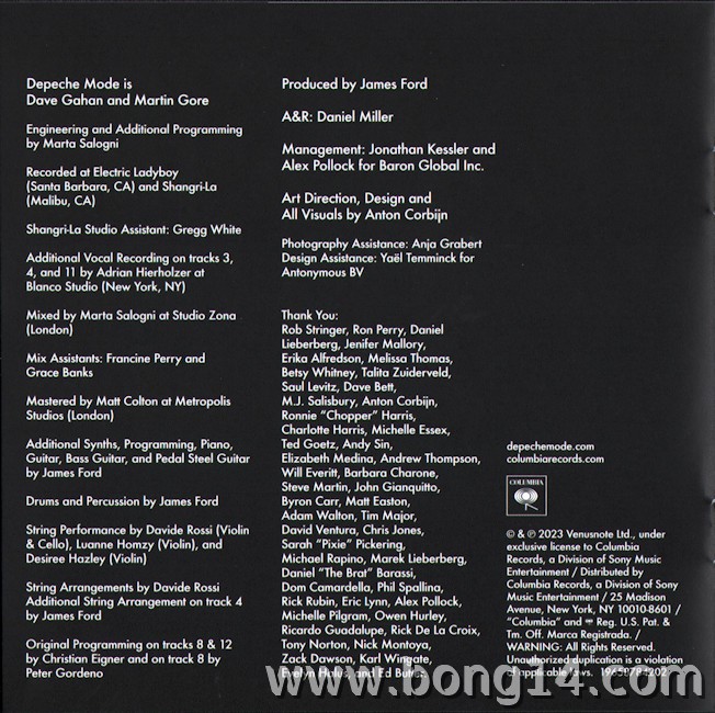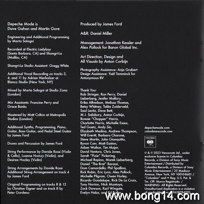 LP/532: Depeche Mode - Memento Mori - EU - 2023 - Columbia - 19658784211 - 196587842116Matrixcode Seite 1: 254256E1 1516023 MRP4386/19658784211-A 19658784211 A6 =MATT@METROPOLIS=Matrixcode Seite 2: 254256E2 1506364 MRP4386/19658784211-B 19658784211 B3Matrixcode Seite 3: 254256E3 1495661 MRP4386/19658784211-C 19658784211 C7 =MATT@METROPOLIS=1: My Cosmos Is Mine - 00:002: Wagging Tongue - 00:003: Ghosts Again - 00:004: Don't Say You Love Me - 00:005: My Favourite Stranger - 00:006: Soul With Me - 00:007: Caroline's Monkey - 00:008: Before We Drown - 00:009: People Are Good - 00:0010: Always You - 00:0011: Never Let Me Go - 00:0012: Speak To Me - 00:00 |