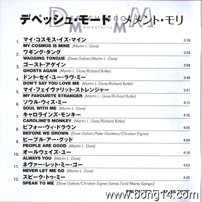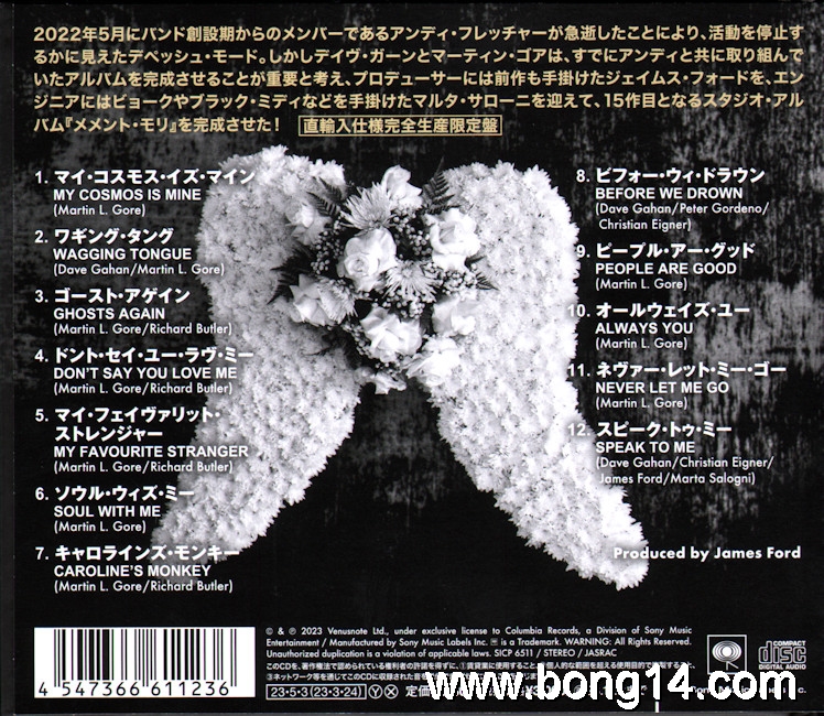 CD/1207: Depeche Mode - Memento Mori - Japan - 2023 - Columbia - SICP 6511 - 4547366611236EU release with obi and Japanese lyrics bookletMatrixcode CD: 58272813/19658789812RD1 21Mould SID Code: IFPI 072YMastering SID Code: IFPI LB 461: My Cosmos Is Mine - 00:002: Wagging Tongue - 00:003: Ghosts Again - 00:004: Don't Say You Love Me - 00:005: My Favourite Stranger - 00:006: Soul With Me - 00:007: Caroline's Monkey - 00:008: Before We Drown - 00:009: People Are Good - 00:0010: Always You - 00:0011: Never Let Me Go - 00:0012: Speak To Me - 00:00 |