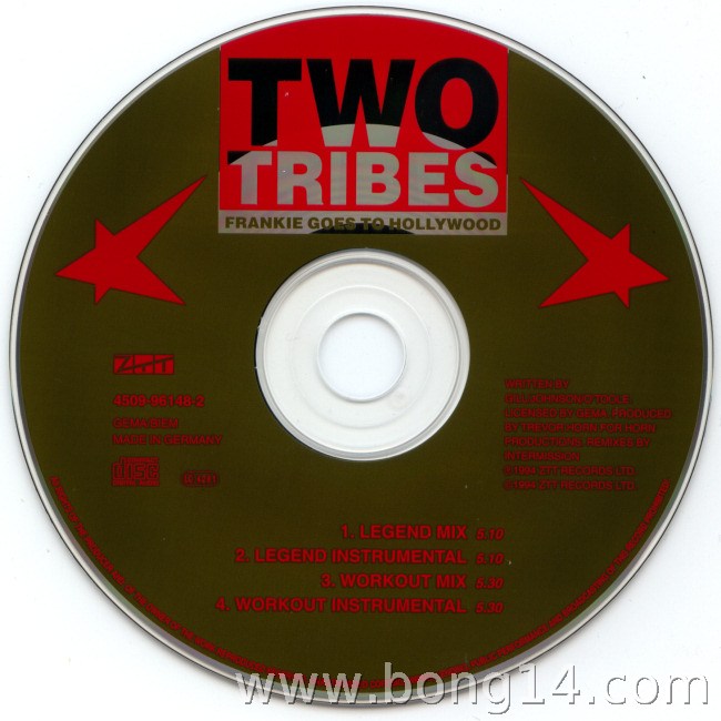 MCD/426: Frankie Goes To Hollywood - Two Tribes '94 - Deutschland - 1994 - ZTT Records - 4509-96148-2 - 745099614829Matrixcode CD: 450996148-2 WME1: Two Tribes (Intermission Legend Mix) - 05:102: Two Tribes (Intermission Legend Instrumental) - 05:103: Two Tribes (Intermission Workout Mix) - 05:304: Two Tribes (Intermission Workout Instrumental) - 05:30 |