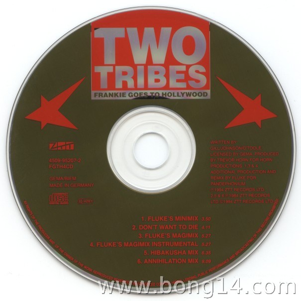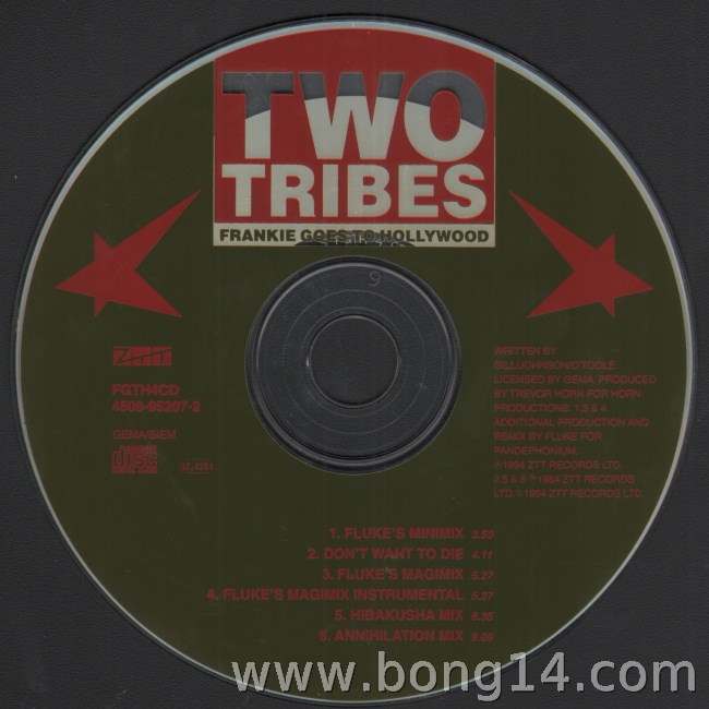 MCD/591: Frankie Goes To Hollywood - Two Tribes '94 - Grossbritannien - 1994 - ZTT Records - FGTH4CD - 745099520724Matrixcode CD: S FGTH 4 CD 01 DISCOTRONICS1: Two Tribes (Fluke's Minimix) - 03:502: Two Tribes (Don't Want To Die) - 04:113: Two Tribes (Fluke's Magimix) - 05:274: Two Tribes (Fluke's Magimix Instrumental) - 05:275: Two Tribes (Hibakusha Mix) - 06:356: Two Tribes (Annihilation) - 09:09 |