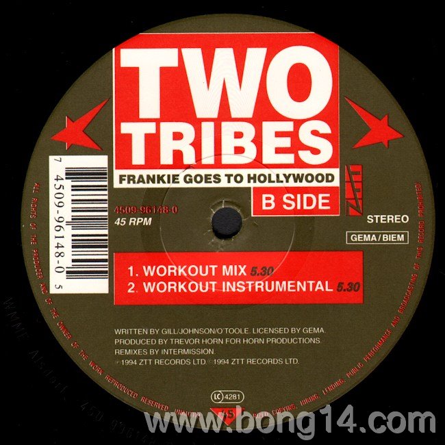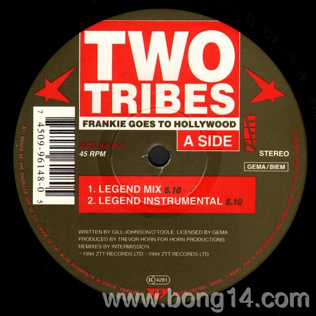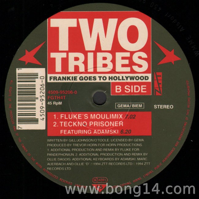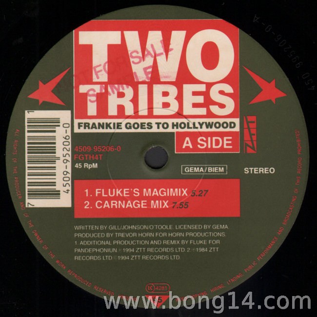 MX/1378: Frankie Goes To Hollywood - Two Tribes '94 - Deutschland - 1994 - ZTT Records - FGTH4T - 745099520601with promo stamp on label AMatrixcode Seite 1: WMME Alsdorf 450 995206-0-AMatrixcode Seite 2: WMME Alsdorf 450 995206-0-B1: Two Tribes (Fluke's Magimix) - 05:272: Two Tribes (Carnage) - 07:553: Two Tribes (Fluke's Moulimix) - 07:024: Two Tribes (Tekno Prisoner Mix) - 06:20 |