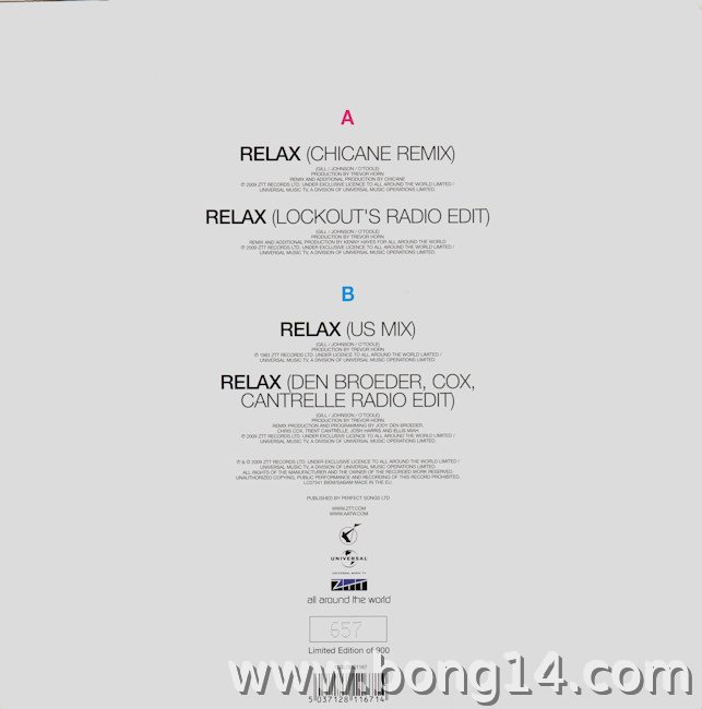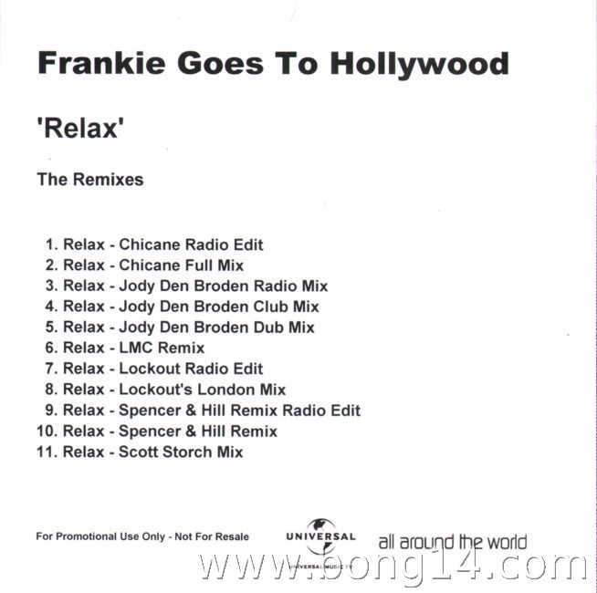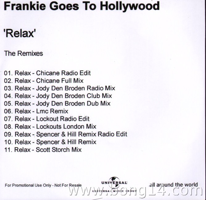 MCD/662: Frankie Goes To Hollywood - Relax '09 (Promo) - Grossbritannien - 2009 - Universal Music - - - -bootleg copy1: Relax (Chicane Radio Edit) - 00:002: Relax (Chicane Full Mix) - 00:003: Relax (Jody Den Broden Radio Mix) - 00:004: Relax (Jody Den Broden Club Mix) - 00:005: Relax (Jody Den Broden Dub Mix) - 00:006: Relax (LMC Remix) - 00:007: Relax (Lockout Radio Edit) - 00:008: Relax (Lockout's London Mix) - 00:009: Relax (Spencer & Hill Remix Radio Edit) - 00:0010: Relax (Spencer & Hill Remix) - 00:0011: Relax (Scott Storch Mix) - 00:00 |